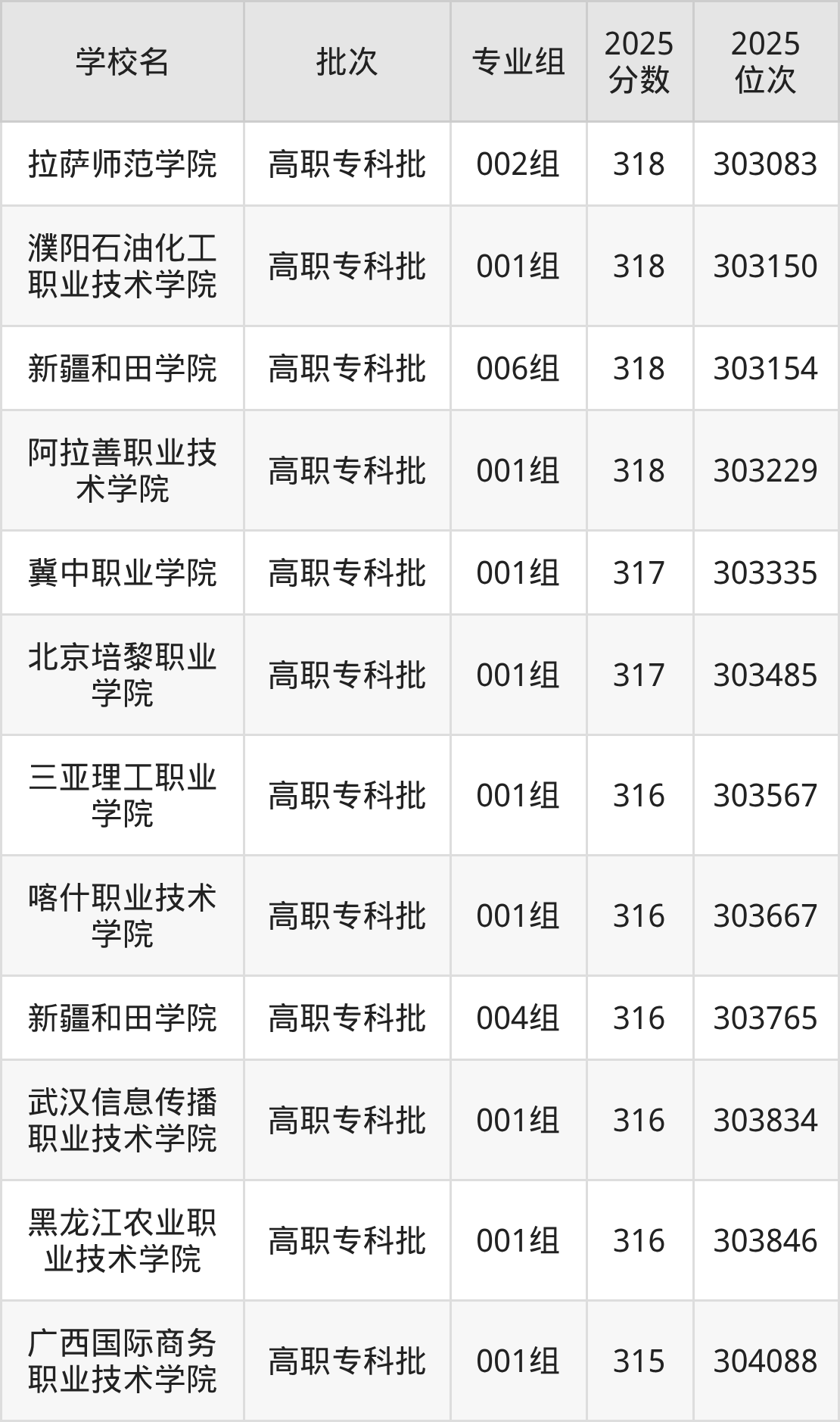 2025年安徽高考物理类316分(303559名~303894名)能上的大学有黑龙江农业职业技术学院001组、喀什职业技术学院001组、三亚理工职业学院001组、武汉信息传播职业技术学院001组等。