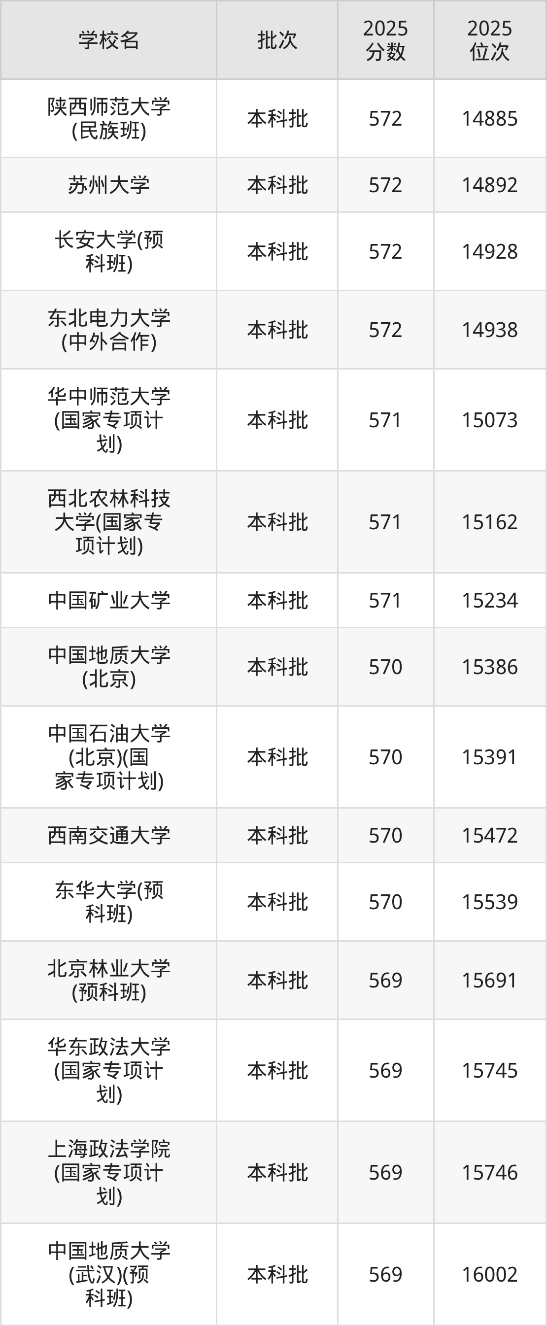 2025年贵州高考物理类570分(15353名~15689名)能上的大学有中国石油大学(北京)(国家专项计划)、西南交通大学、东华大学(预科班)、中国地质大学(北京)。