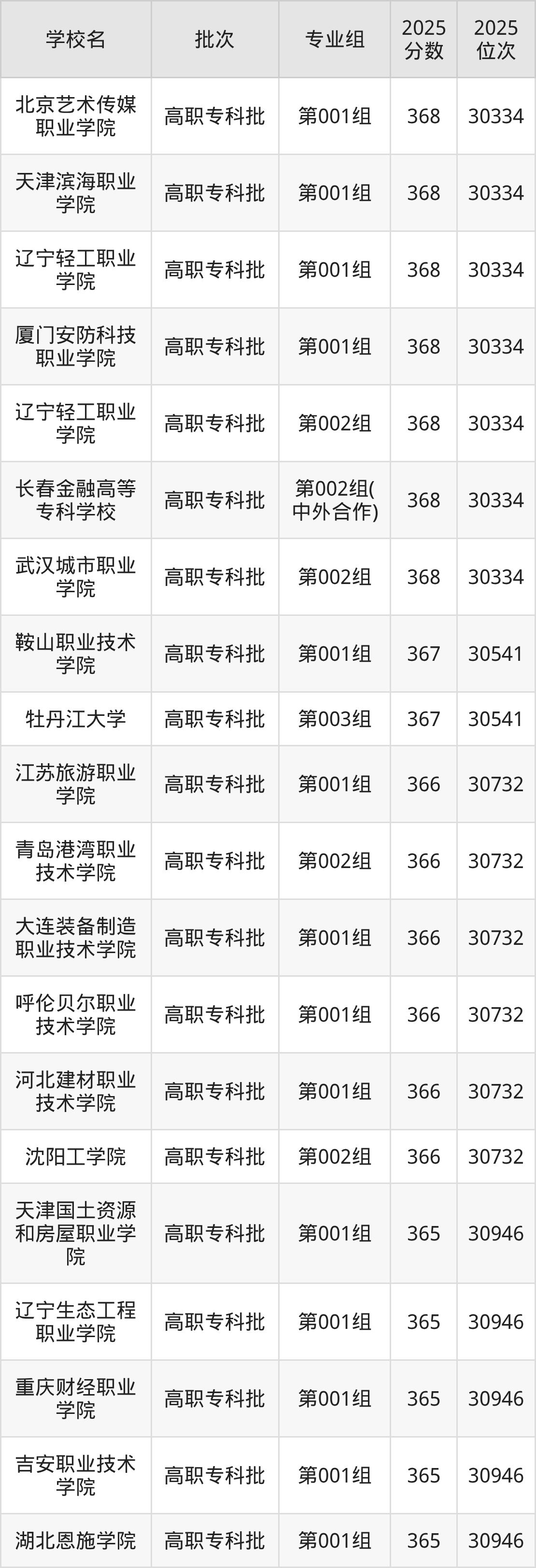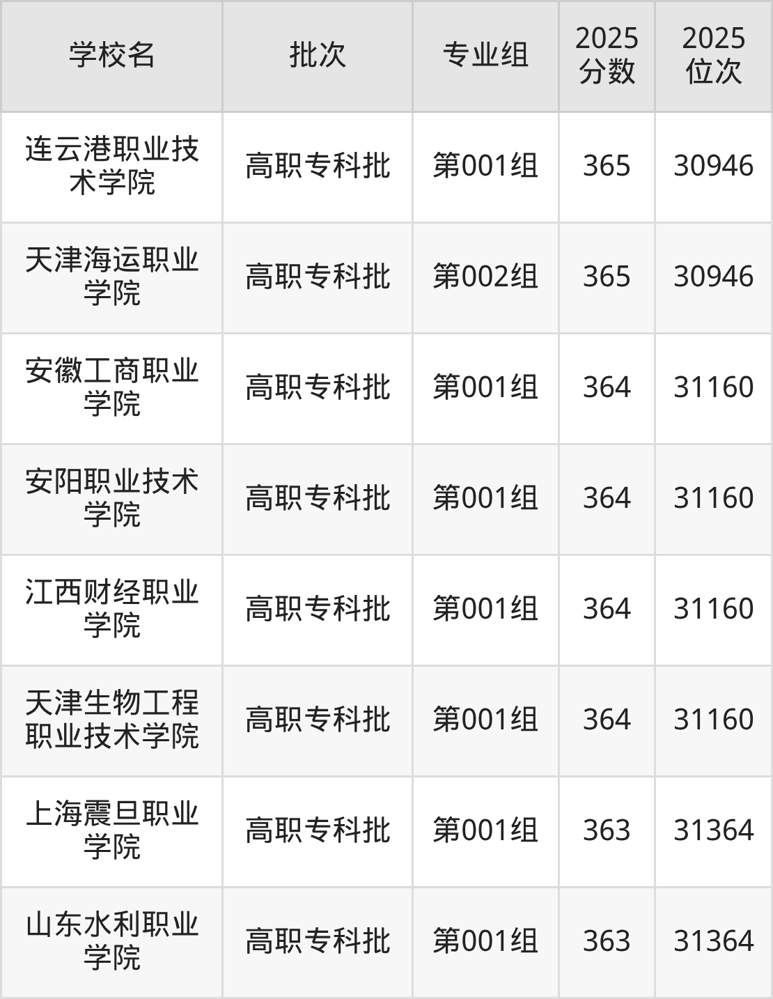 2025年黑龙江高考历史类365分(30733名~30946名)能上的大学有湖北恩施学院第001组、天津国土资源和房屋职业学院第001组、天津海运职业学院第002组、辽宁生态工程职业学院第001组等。