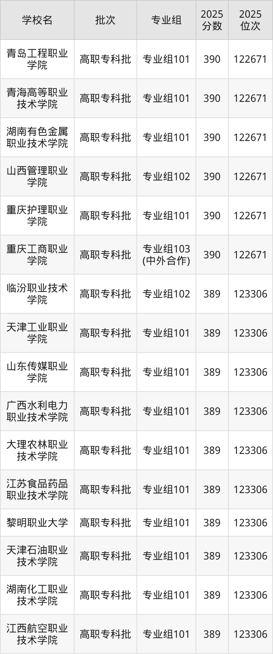 2025年四川高考历史类389分(122672名~123306名)能上的大学有临汾职业技术学院专业组102、天津工业职业学院专业组101、江西航空职业技术学院专业组101、湖南化工职业技术学院专业组101等。