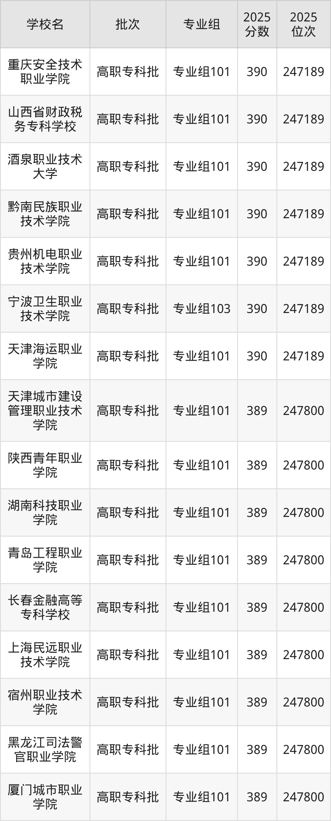 2025年四川高考物理类389分(247190名~247800名)能上的大学有天津城市建设管理职业技术学院专业组101、厦门城市职业学院专业组101、黑龙江司法警官职业学院专业组101、宿州职业技术学院专业组101等。