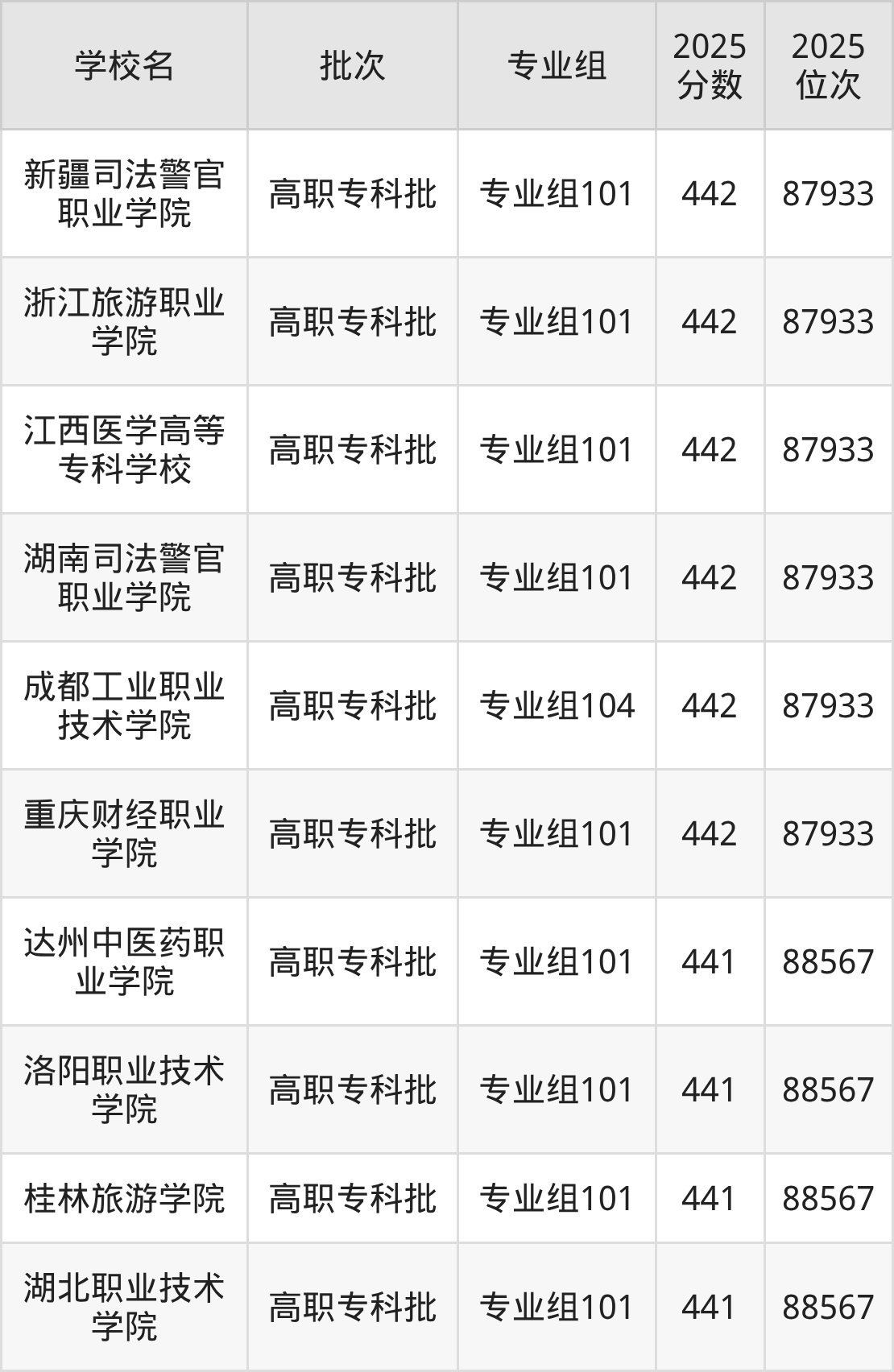 2025年四川高考历史类441分(87934名~88567名)能上的大学有桂林旅游学院专业组101、洛阳职业技术学院专业组101、湖北职业技术学院专业组101、达州中医药职业学院专业组101。