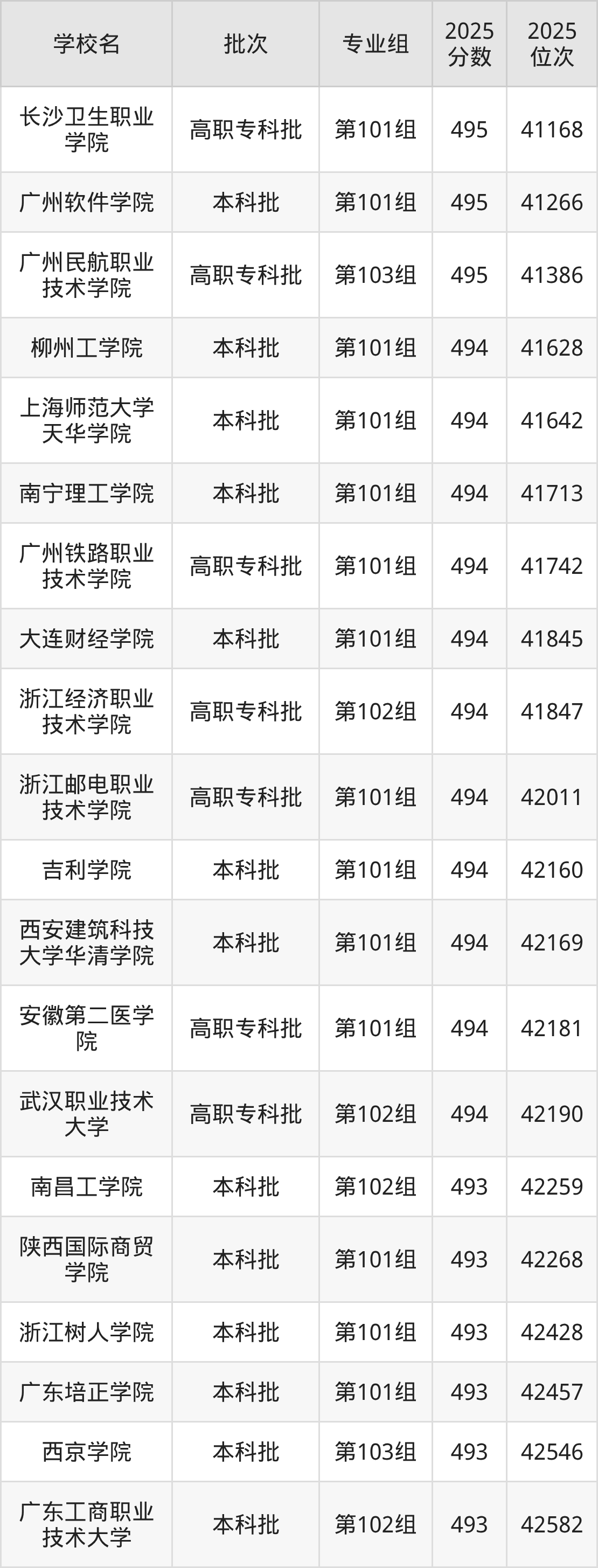 2025年江西高考历史类494分(41626名~42250名)能上的大学有大连财经学院第101组、上海师范大学天华学院第101组、柳州工学院第101组、南宁理工学院第101组等。