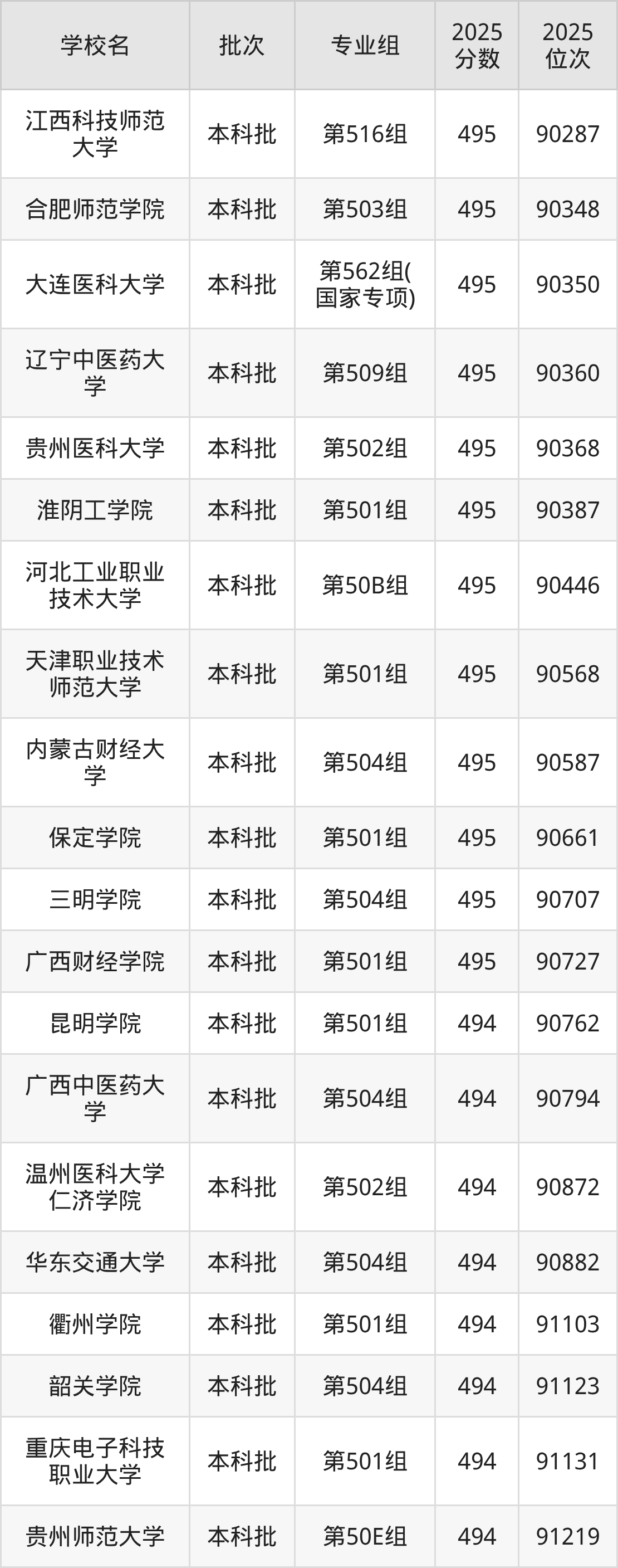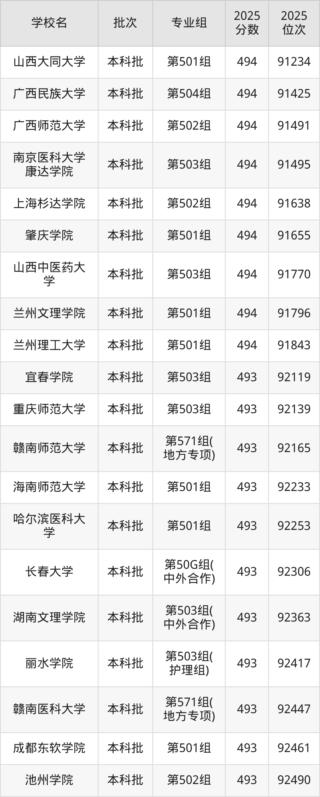 2025年江西高考物理类494分(90757名~92002名)能上的大学有广西师范大学第502组、贵州师范大学第50E组、山西大同大学第501组、山西中医药大学第503组等。