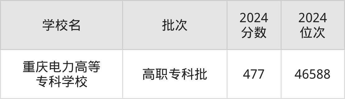 2024年云南高考文科477分(46050名~46588名)能上的大学有重庆电力高等专科学校。