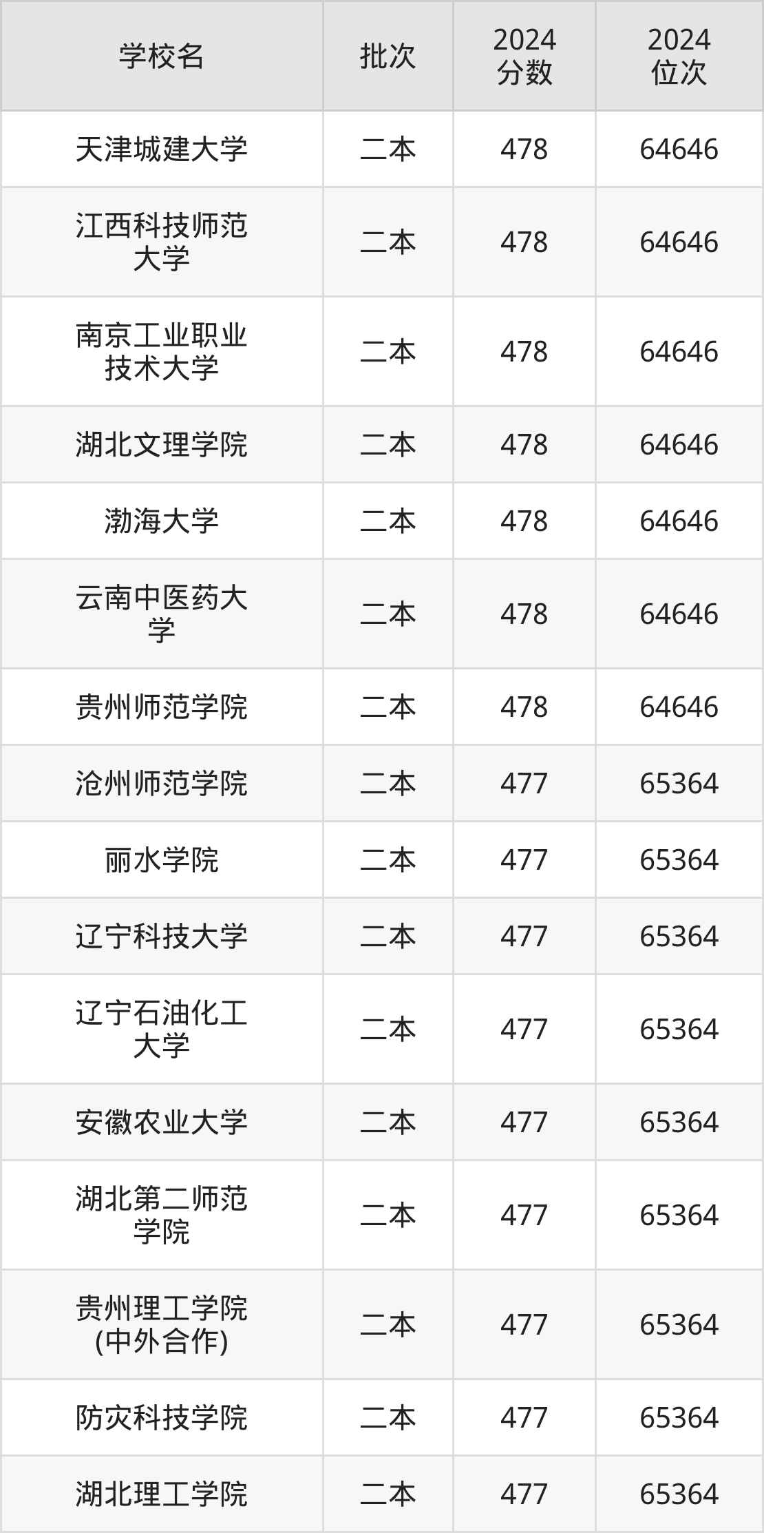 这些都是2025年高考理科64647名~65364名考生可以报考的大学,更多学校名单如下表所示: