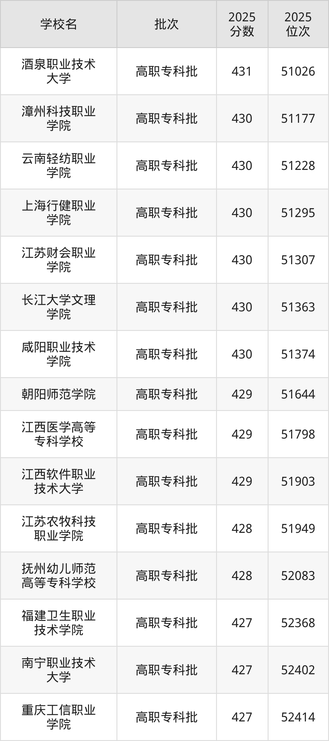 另外录取位次低于该区间(较稳妥)的有江苏农牧科技职业学院(51949名)、抚州幼儿师范高等专科学校(52083名)等;录取位次高于该区间(可冲)的有咸阳职业技术学院(51374名)、长江大学文理学院(51363名)等。