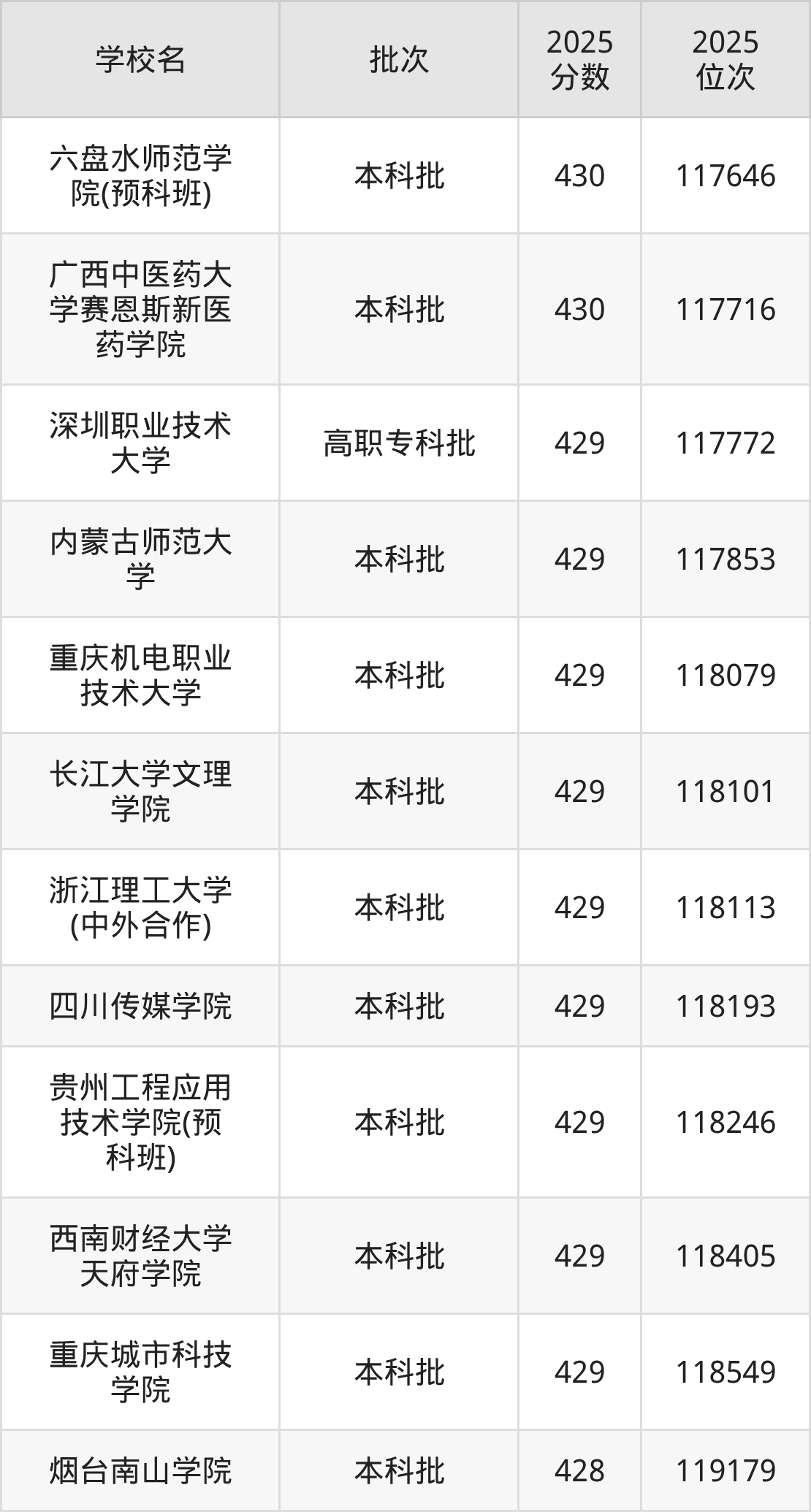 2025年贵州高考物理类429分(117717名~118729名)能上的大学有浙江理工大学(中外合作)、重庆城市科技学院、西南财经大学天府学院、重庆机电职业技术大学等。