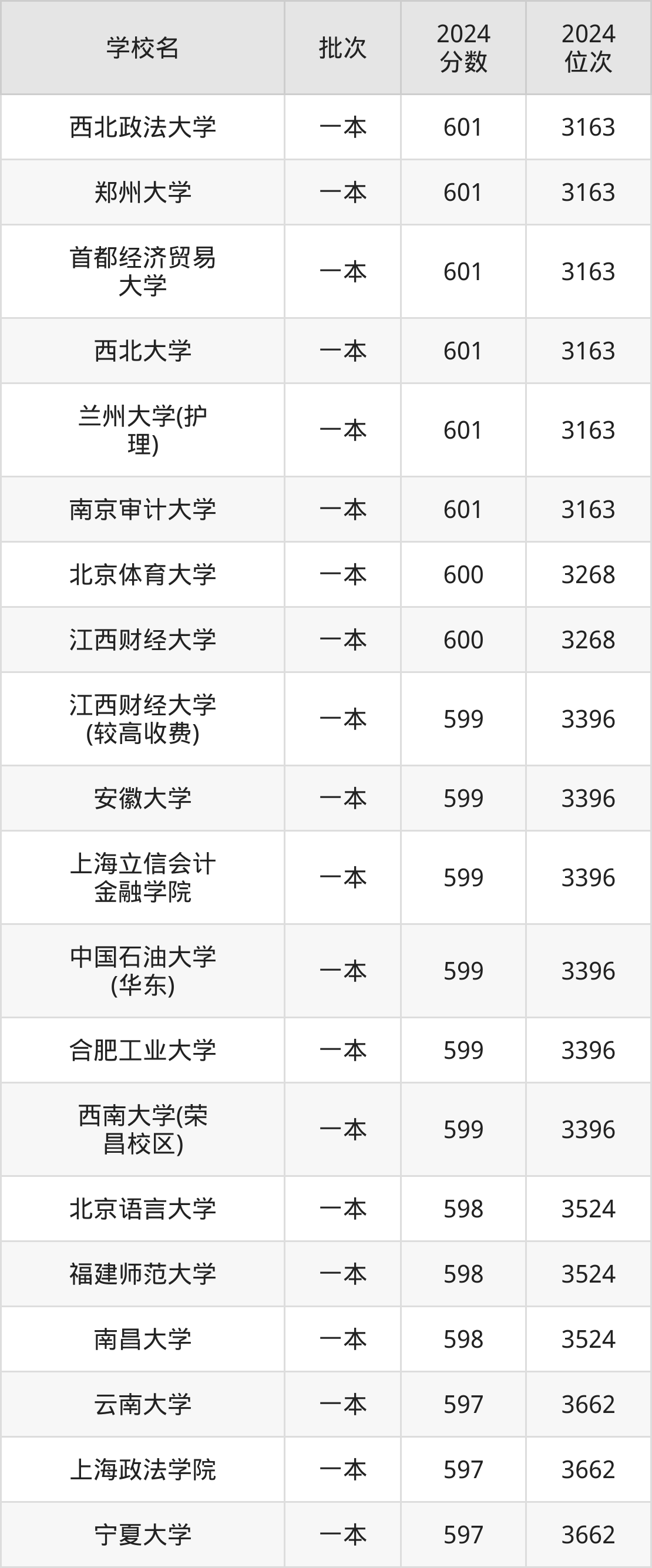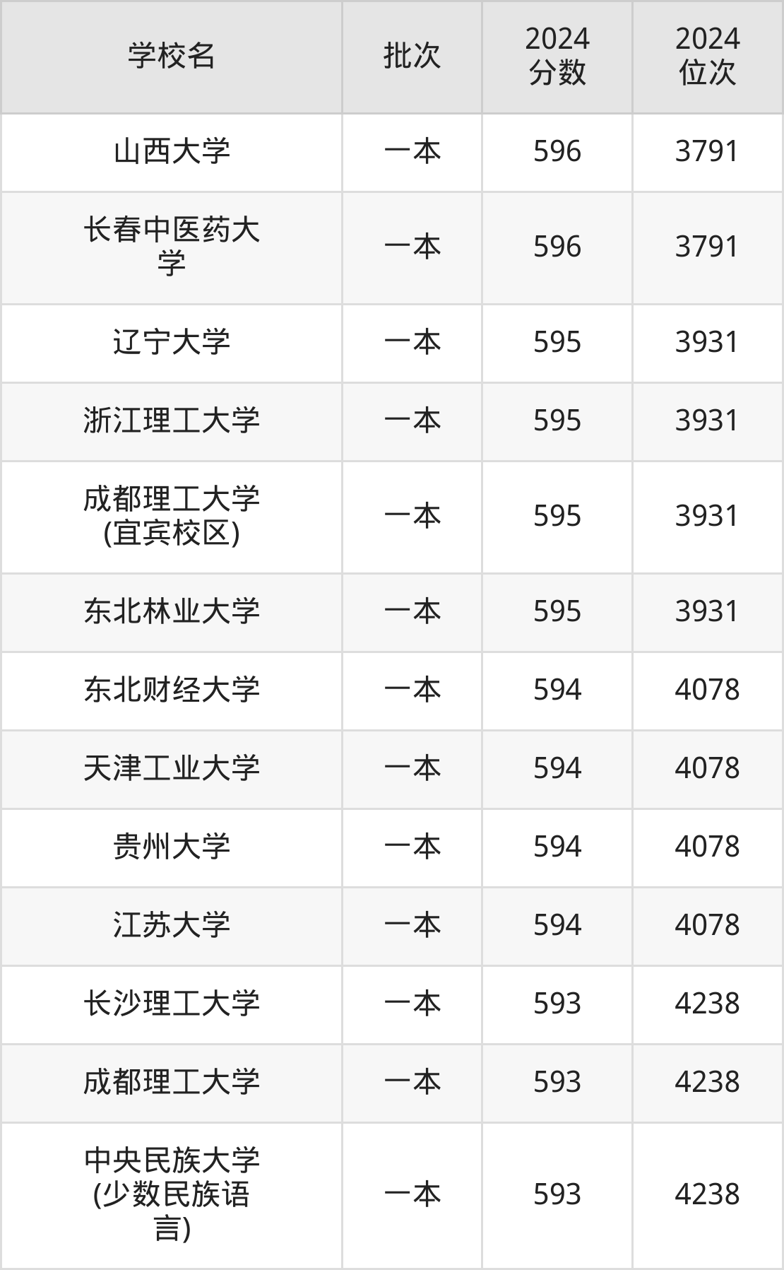 2024年云南高考文科596分(3663名~3791名)能上的大学有山西大学、长春中医药大学。