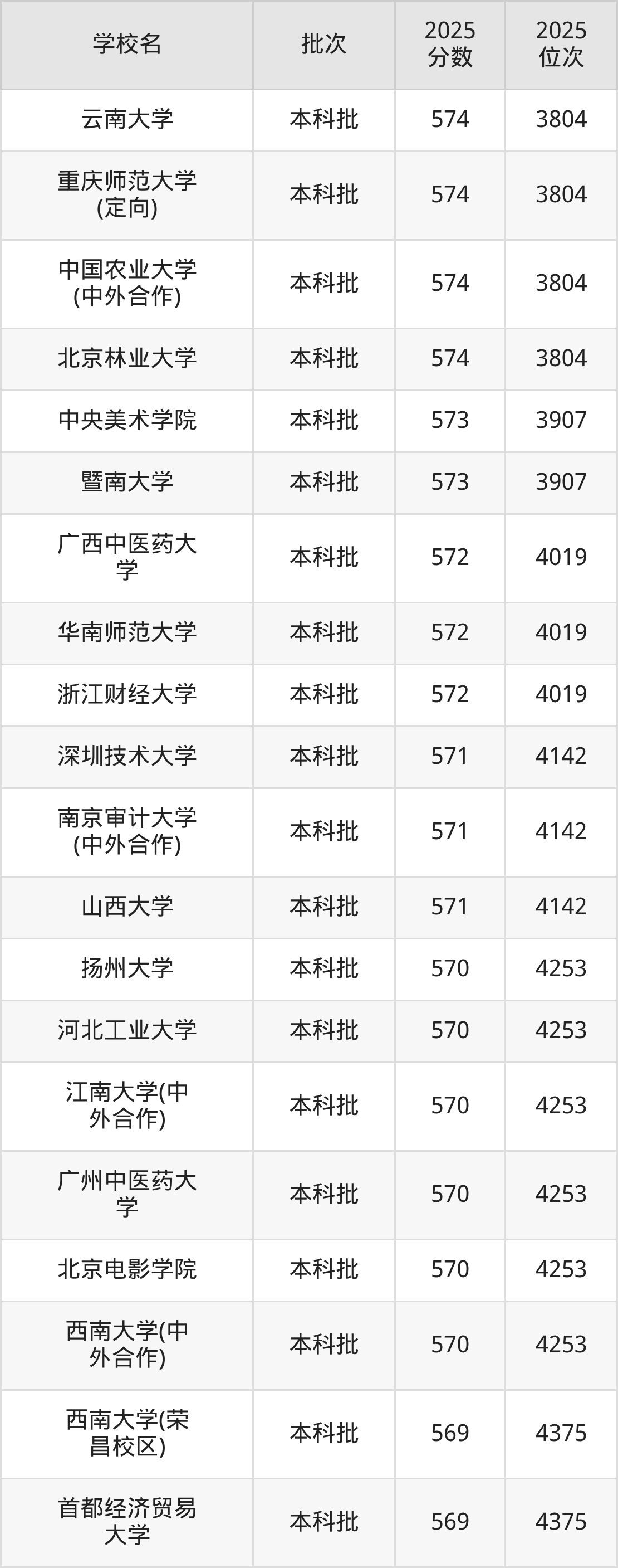 2025年重庆高考历史类573分(3805名~3907名)能上的大学有暨南大学、中央美术学院。