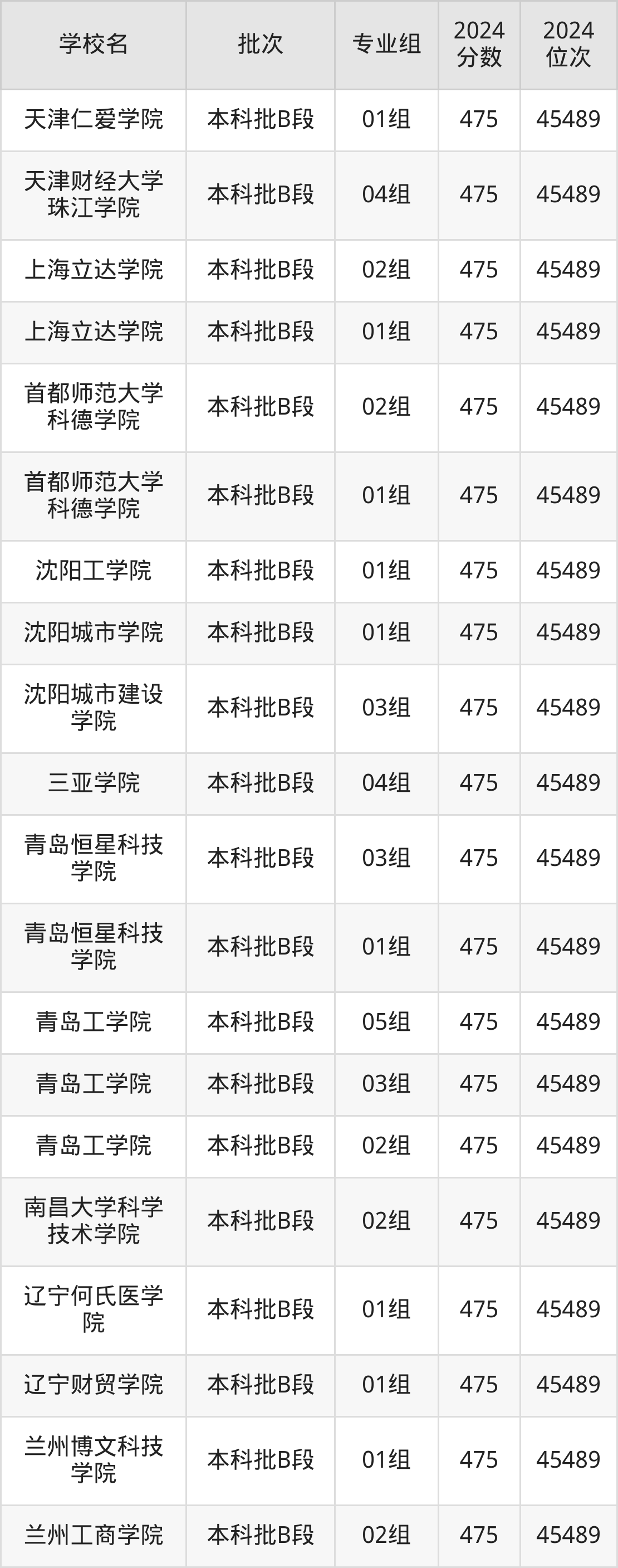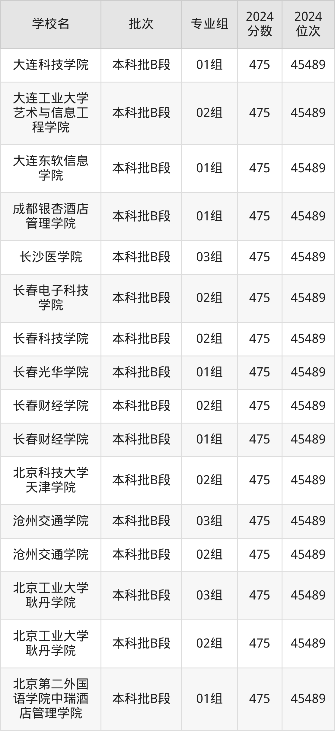 2024年天津高考475分(45234名~45489名)能上的大学有北京第二外国语学院中瑞酒店管理学院01组、北京工业大学耿丹学院02组、北京工业大学耿丹学院03组、沧州交通学院02组等。