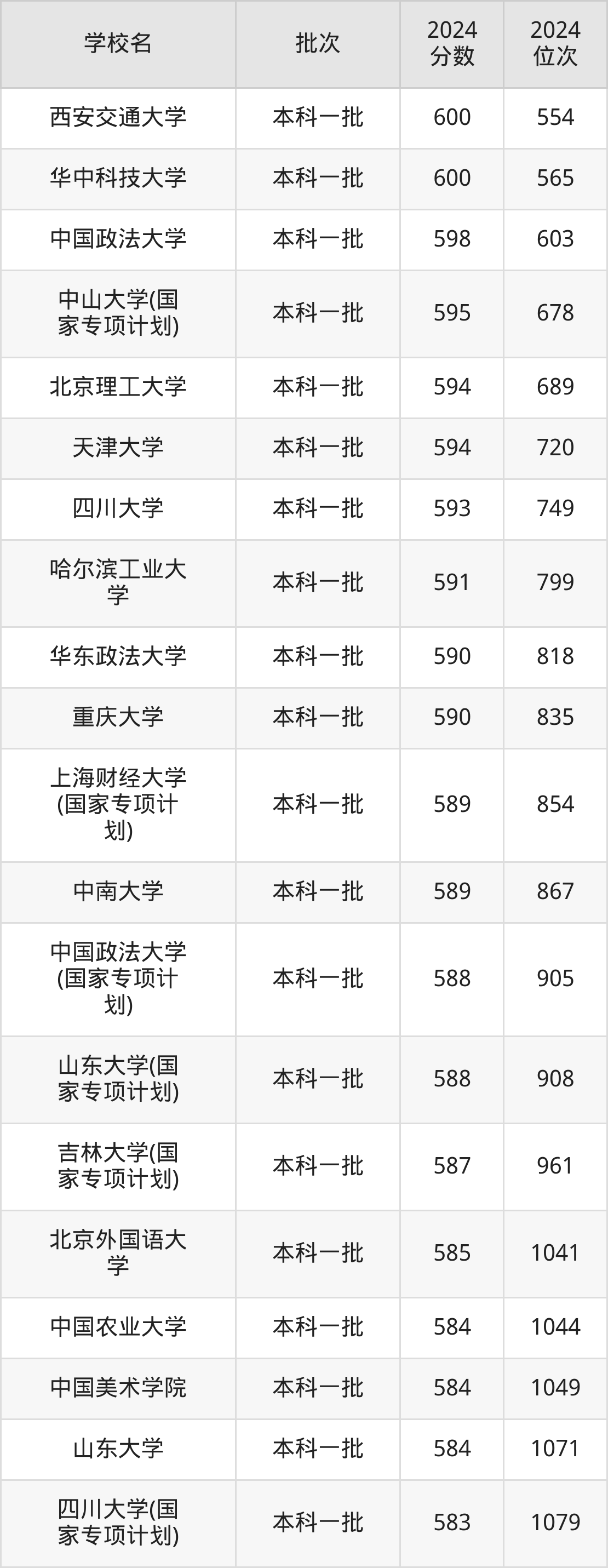 另外录取位次低于该区间(较稳妥)的有哈尔滨工业大学(799名)、华东政法大学(818名)等;录取位次高于该区间(可冲)的有天津大学(720名)、北京理工大学(689名)等。