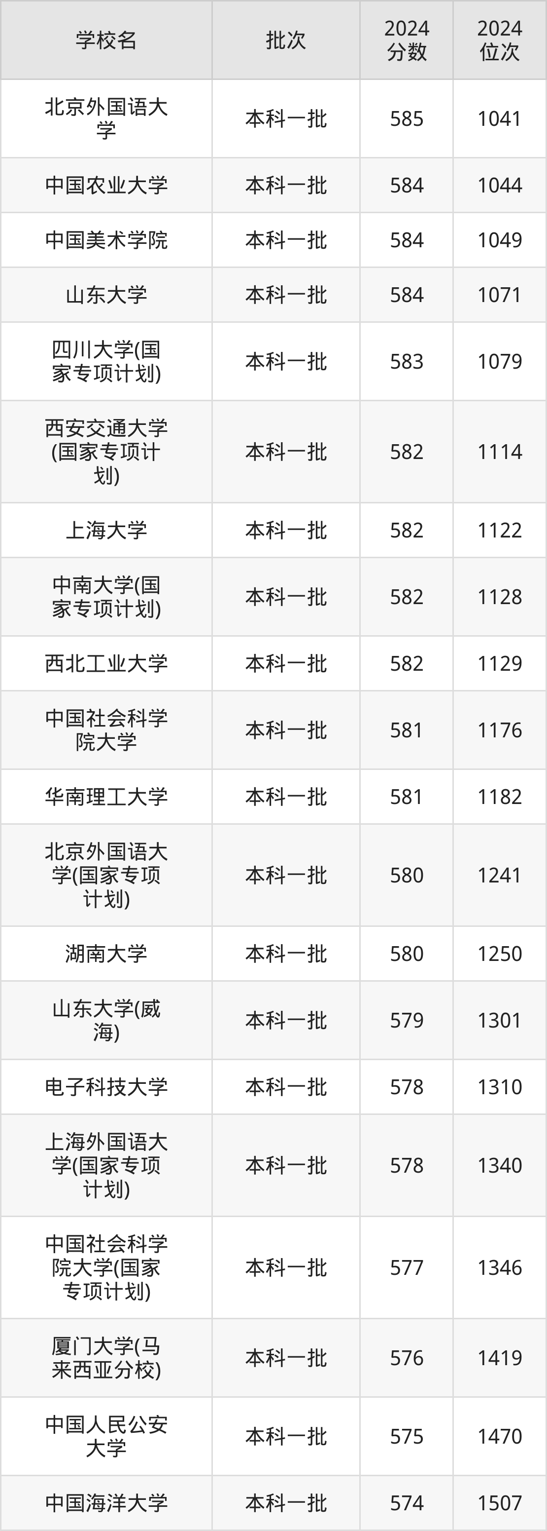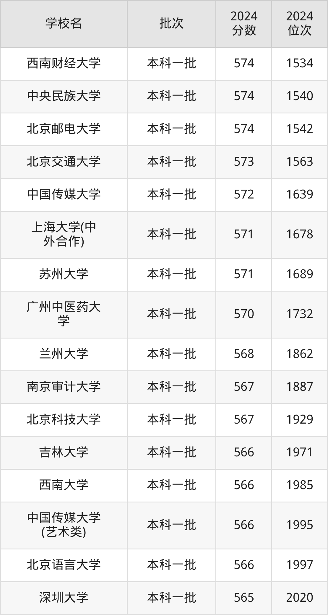 2024年陕西高考文科574分(1489名~1545名)能上的大学有北京邮电大学、中央民族大学、中国海洋大学、西南财经大学。
