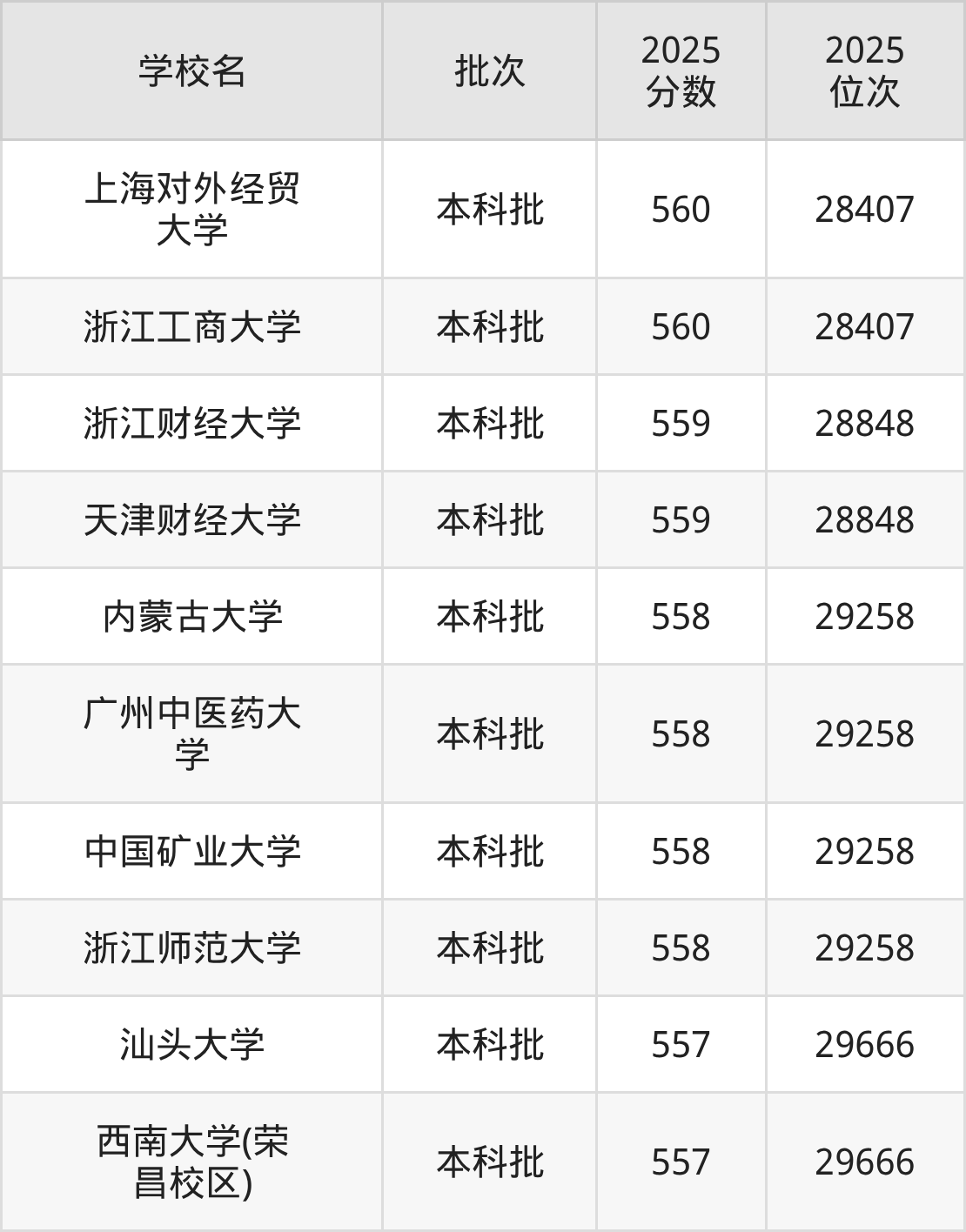 2025年辽宁高考历史类558分(5862名~5973名)能上的大学有安徽财经大学、上海对外经贸大学。