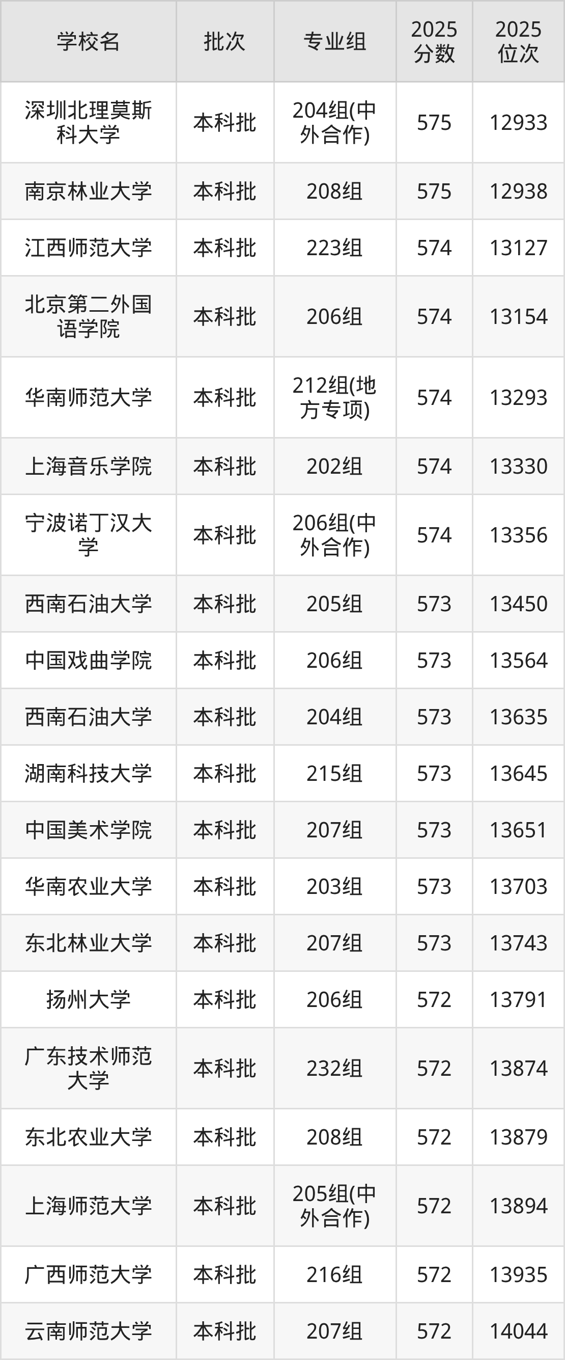 2025年广东高考历史类573分(13404名~13763名)能上的大学有中国戏曲学院206组、东北林业大学207组、中国美术学院207组、湖南科技大学215组等。