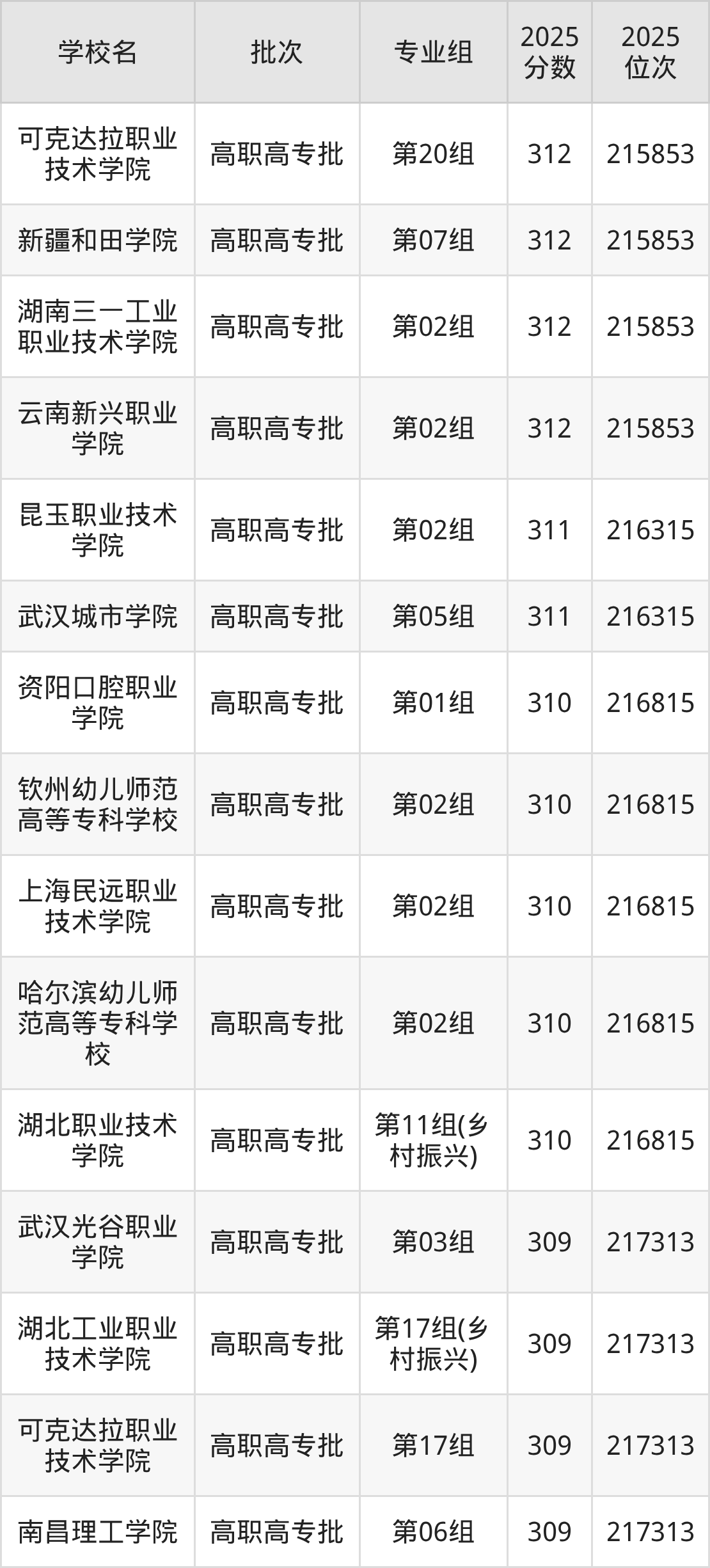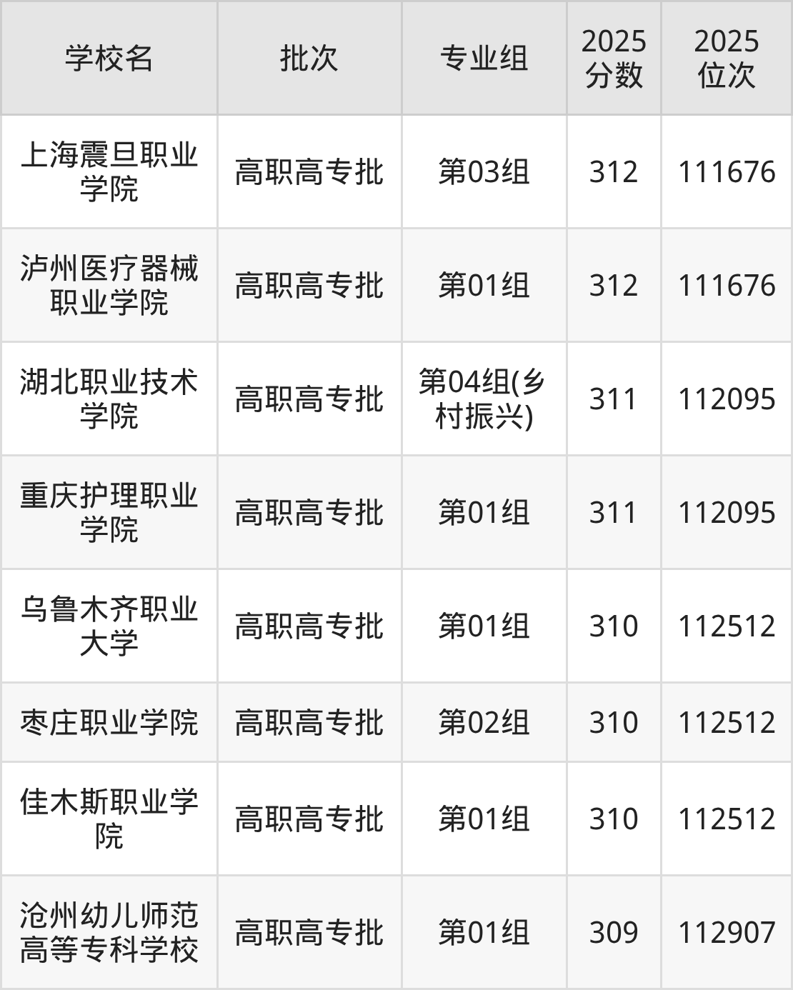 2025年湖北高考历史类310分(112096名~112512名)能上的大学有佳木斯职业学院第01组、枣庄职业学院第02组、乌鲁木齐职业大学第01组。