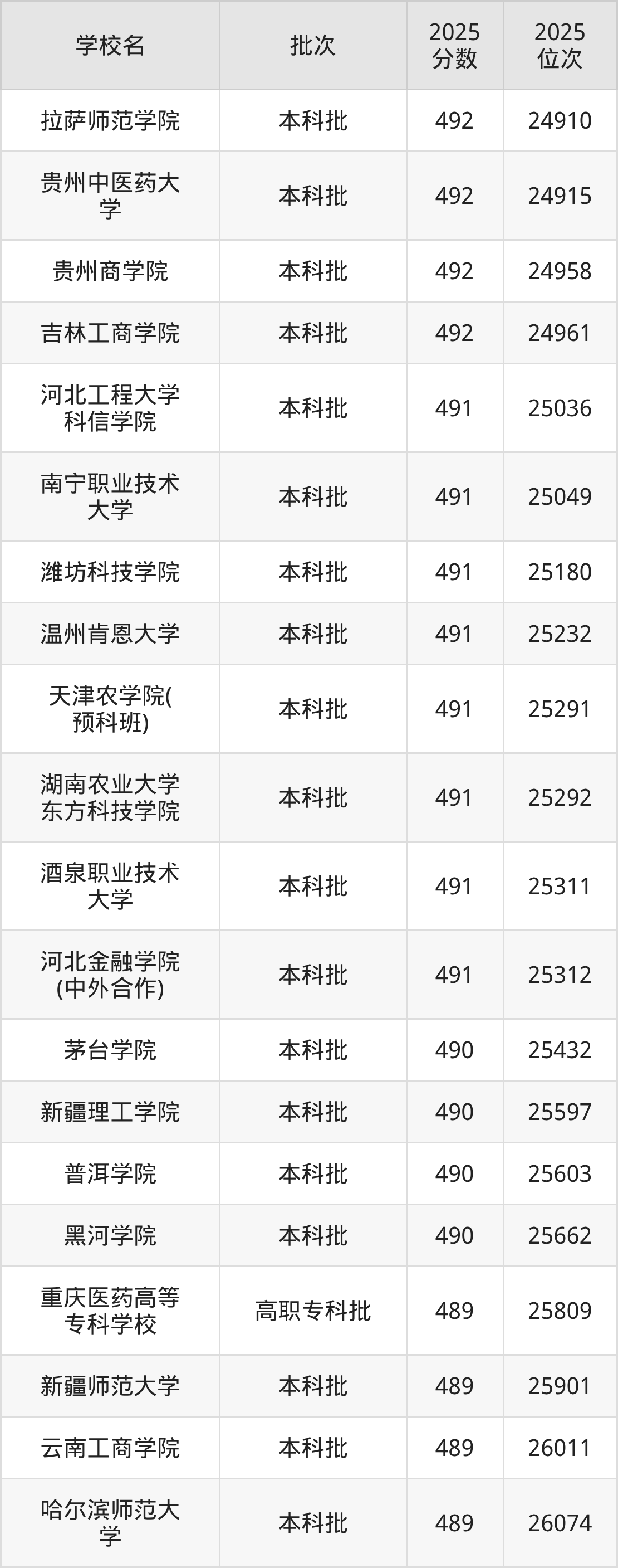 2025年贵州高考历史类490分(25380名~25773名)能上的大学有茅台学院、新疆理工学院、普洱学院、黑河学院。
