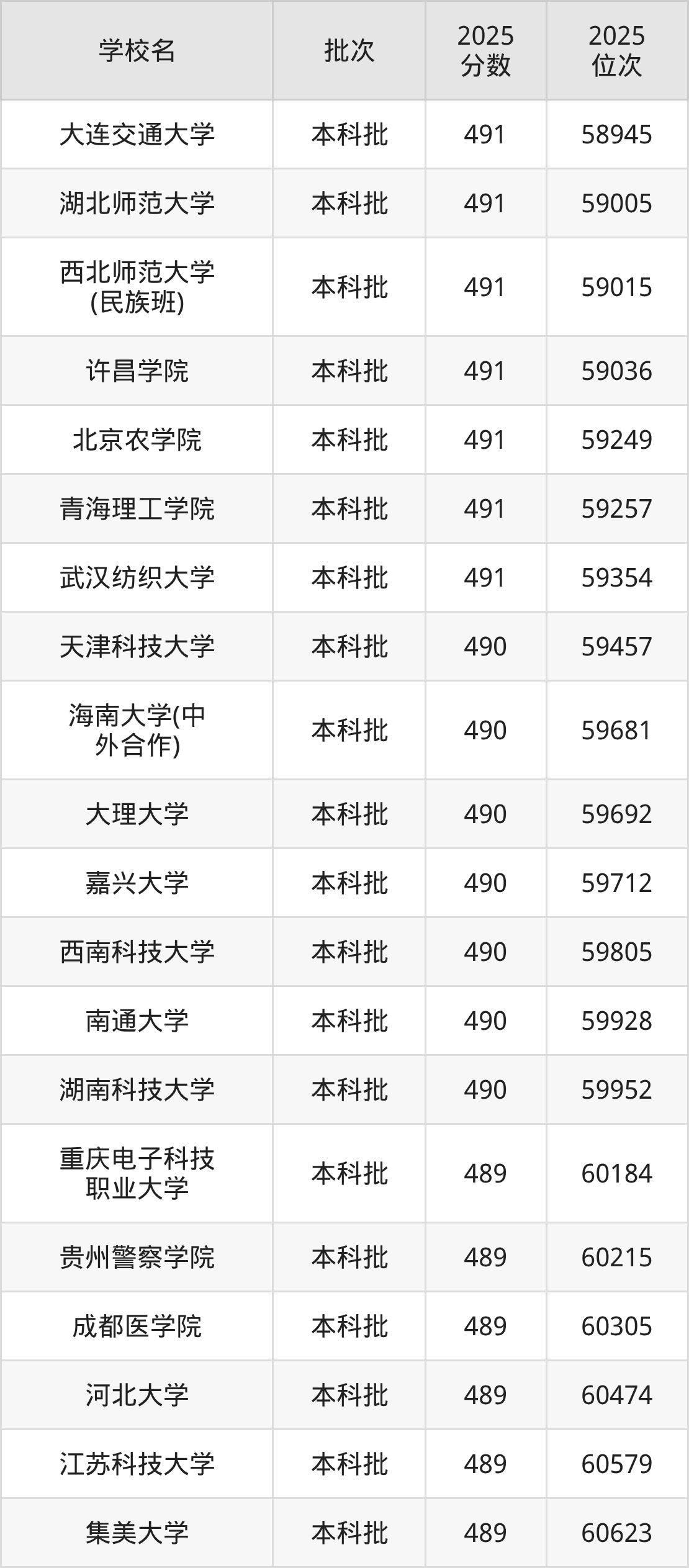 2025年贵州高考物理类490分(59439名~60182名)能上的大学有海南大学(中外合作)、嘉兴大学、西南科技大学、天津科技大学等。