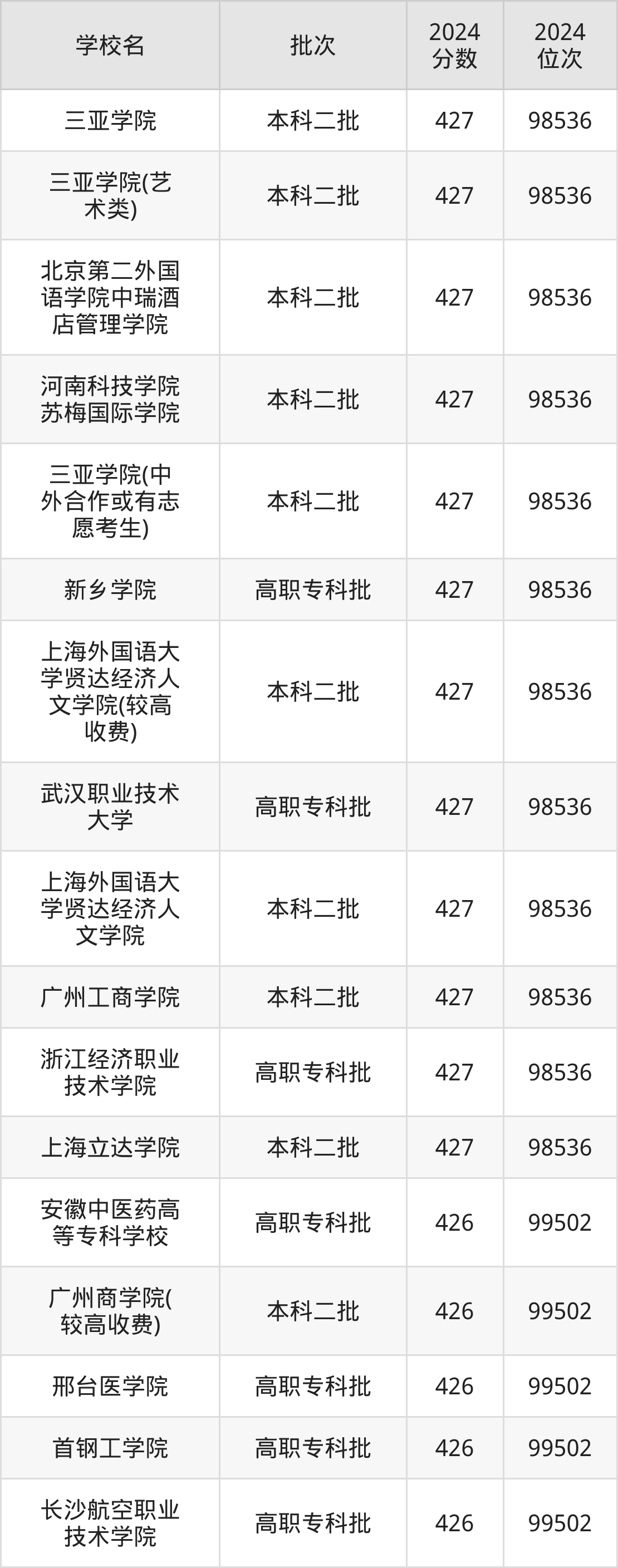 2024年河南高考文科426分(98537名~99502名)能上的大学有长沙航空职业技术学院、安徽中医药高等专科学校、首钢工学院、邢台医学院等。