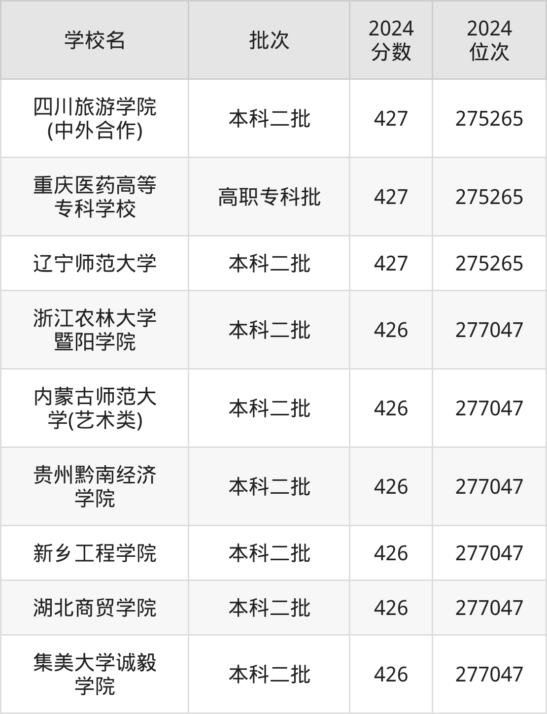 2024年河南高考理科426分(275267名~277048名)能上的大学有集美大学诚毅学院、湖北商贸学院、新乡工程学院、贵州黔南经济学院等。