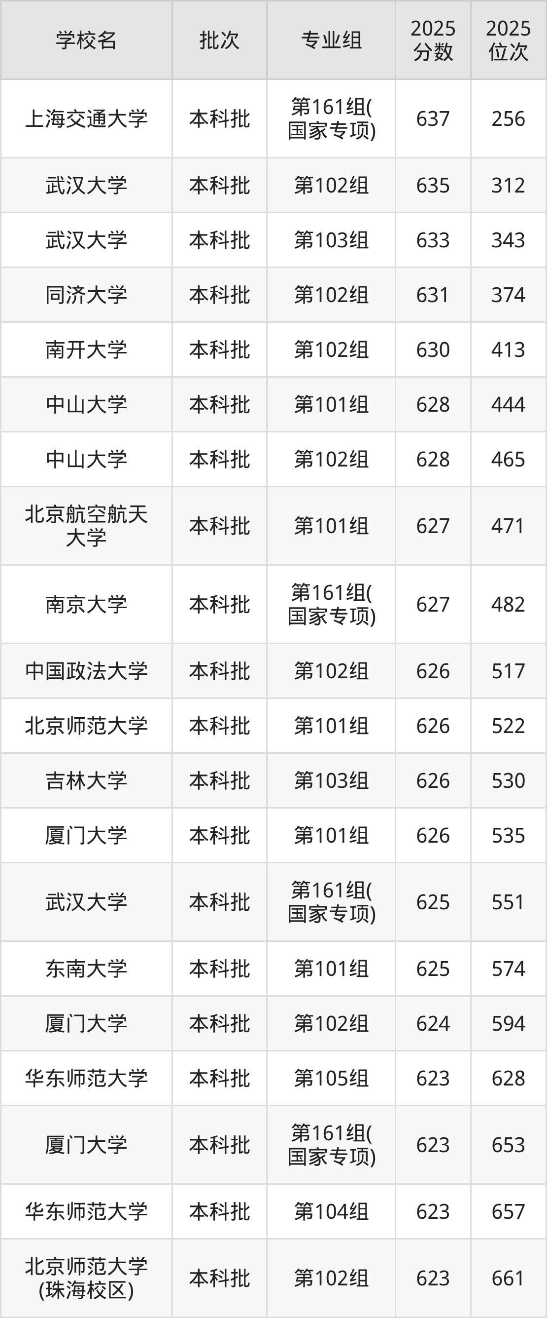 江西高考622分:历史类排名715位、物理类排名3525位。该分数位次对应能上的大学历史类有北京师范大学第161组(国家专项);物理类有北京交通大学第501组、大连理工大学第501组,更多名单如下文所示,2026届考生可参考。
