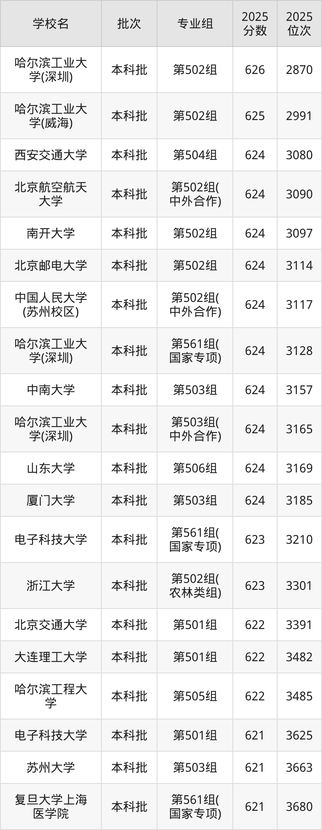 2025年江西高考物理类622分(3360名~3525名)能上的大学有北京交通大学第501组、大连理工大学第501组、哈尔滨工程大学第505组。