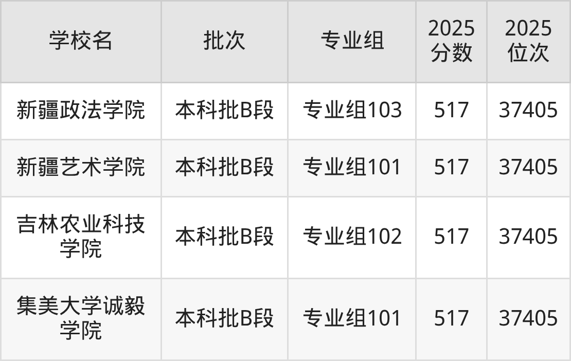 2025年四川高考历史类517分(36793名~37405名)能上的大学有新疆艺术学院专业组101、吉林农业科技学院专业组102、集美大学诚毅学院专业组101、遵义医科大学医学与科技学院专业组101等。