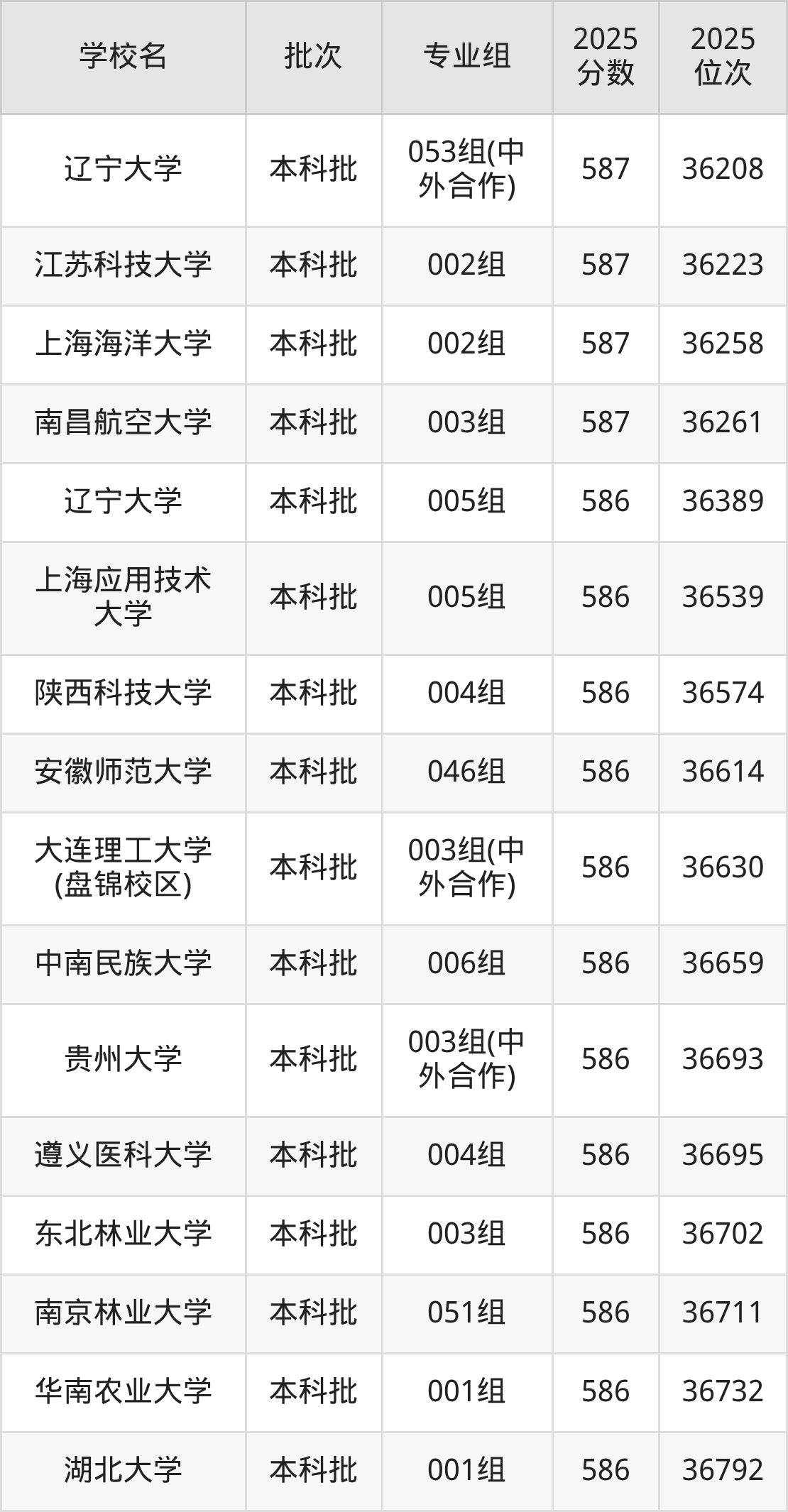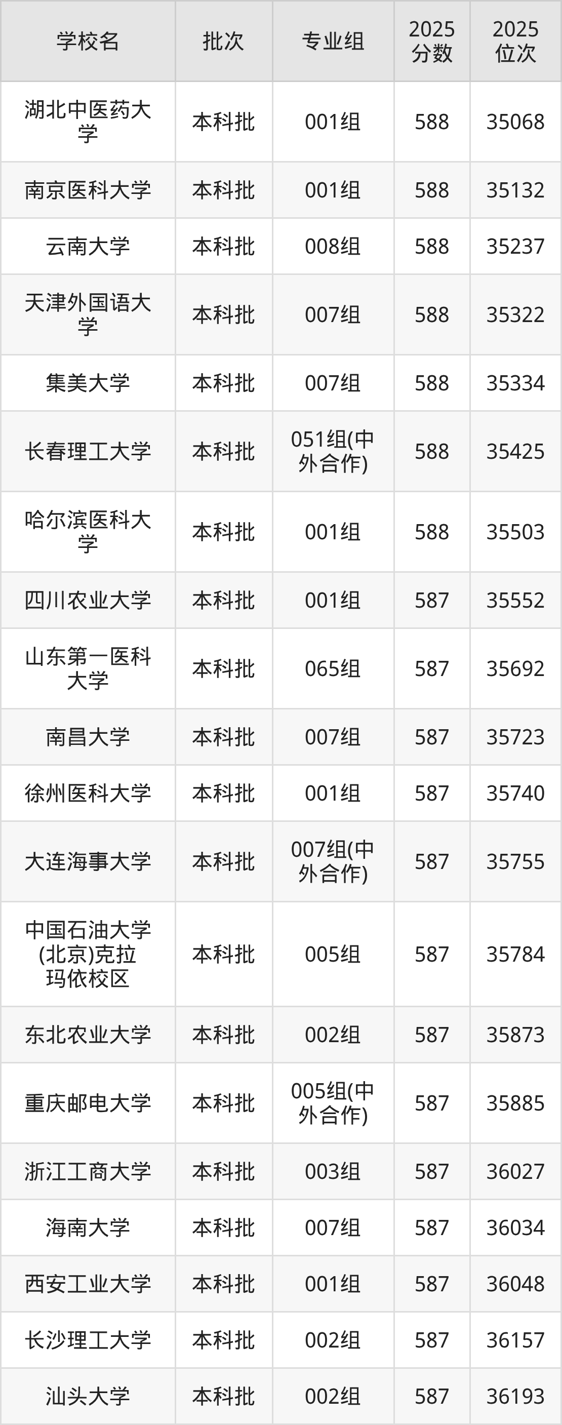 另外录取位次低于该区间(较稳妥)的有辽宁大学005组(36389名)、上海应用技术大学005组(36539名)等;录取位次高于该区间(可冲)的有哈尔滨医科大学001组(35503名)、长春理工大学051组(中外合作)(35425名)等。
