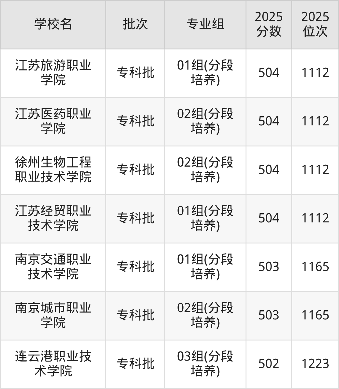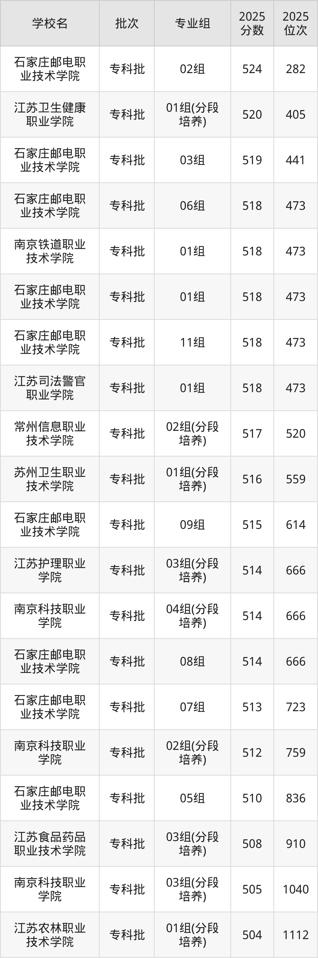 另外录取位次低于该区间(较稳妥)的有江苏司法警官职业学院04组(1195名)、石家庄邮电职业技术学院23组(1357名)等;录取位次高于该区间(可冲)的有扬州职业技术大学04组(143440名)、东南大学成贤学院08组(143440名)等。