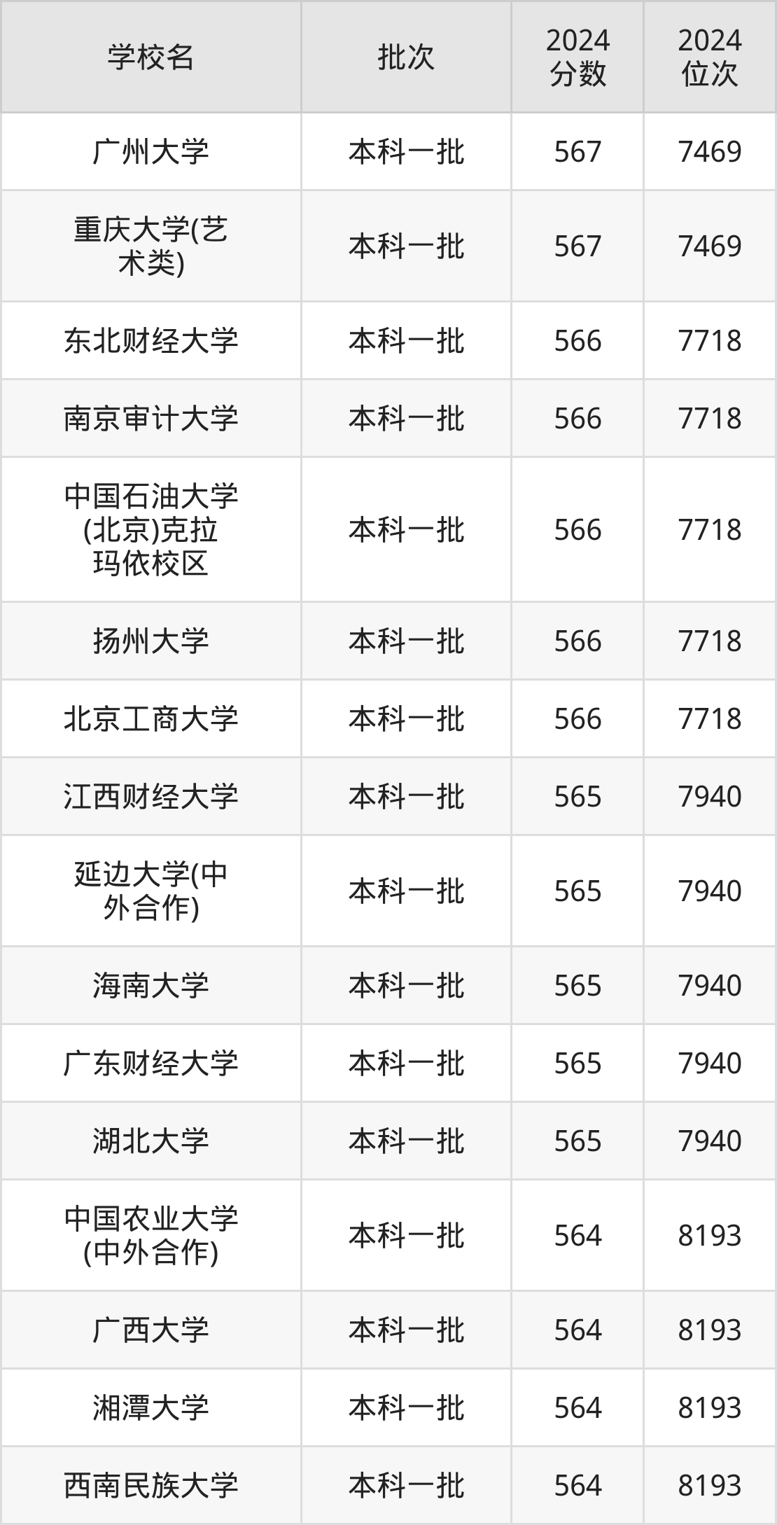这些都是2025年高考文科7719名~7940名考生可以报考的大学,更多学校名单如下表所示:
