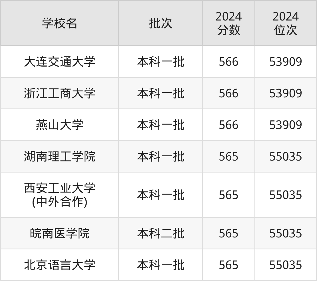 2024年河南高考理科565分(53910名~55035名)能上的大学有北京语言大学、湖南理工学院、皖南医学院、西安工业大学(中外合作)。