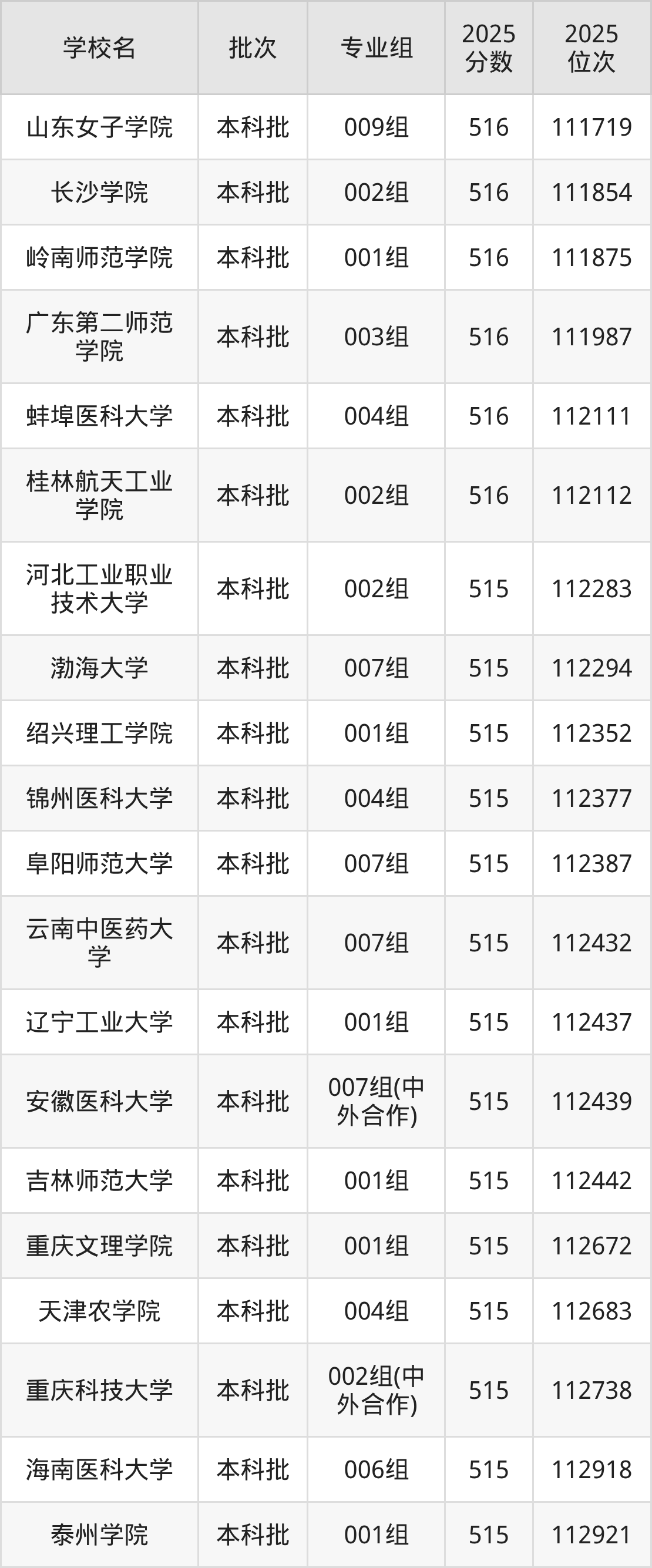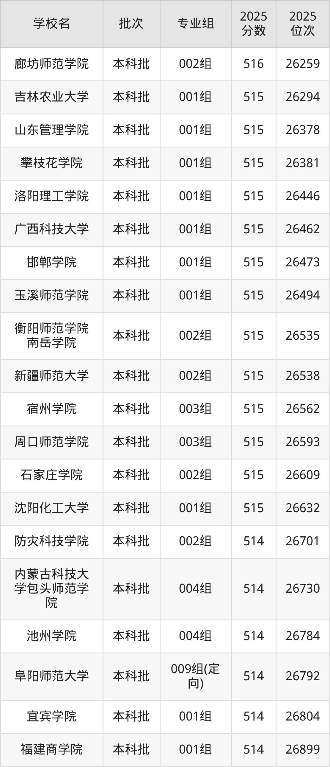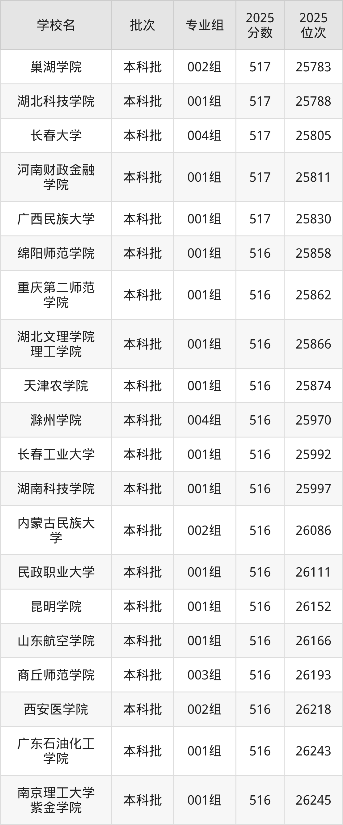 2025年安徽高考历史类515分(26279名~26691名)能上的大学有广西科技大学001组、邯郸学院001组、吉林农业大学001组、洛阳理工学院001组等。