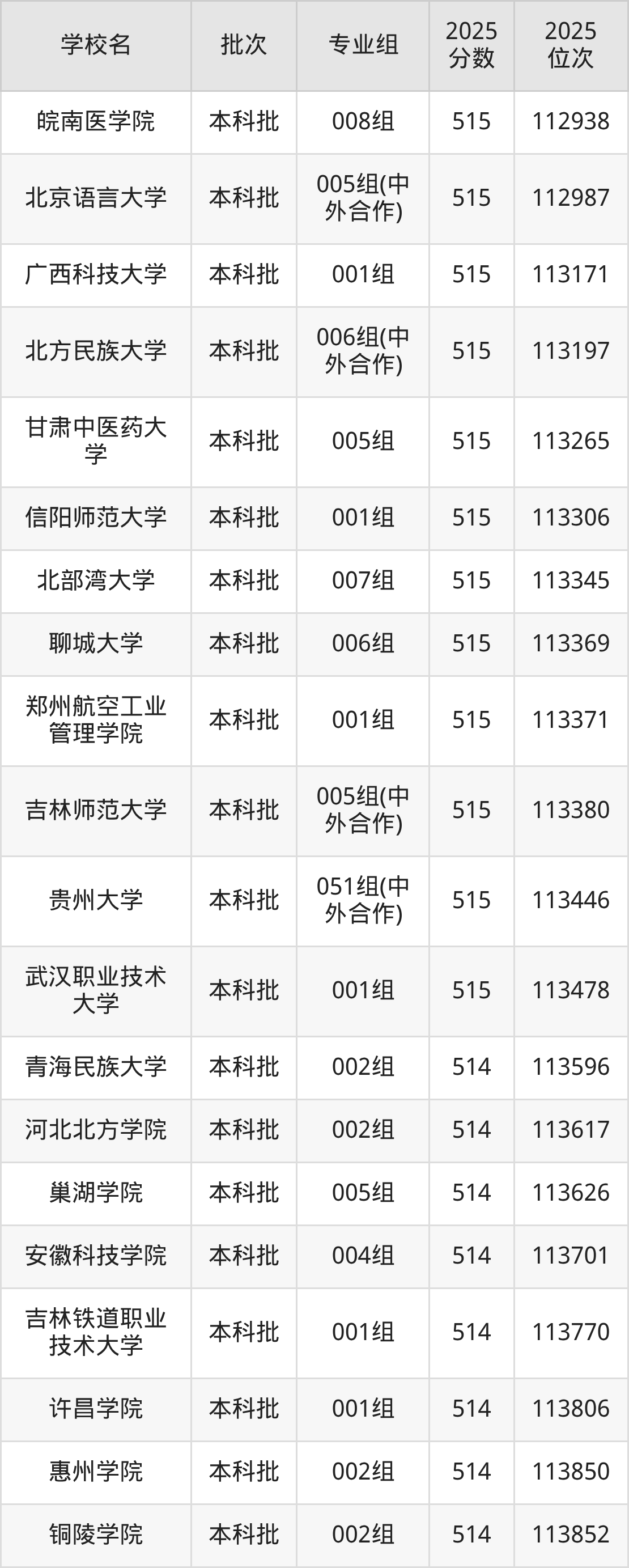 2025年安徽高考物理类515分(112141名~113545名)能上的大学有北部湾大学007组、北方民族大学006组(中外合作)、北京语言大学005组(中外合作)、渤海大学007组等。