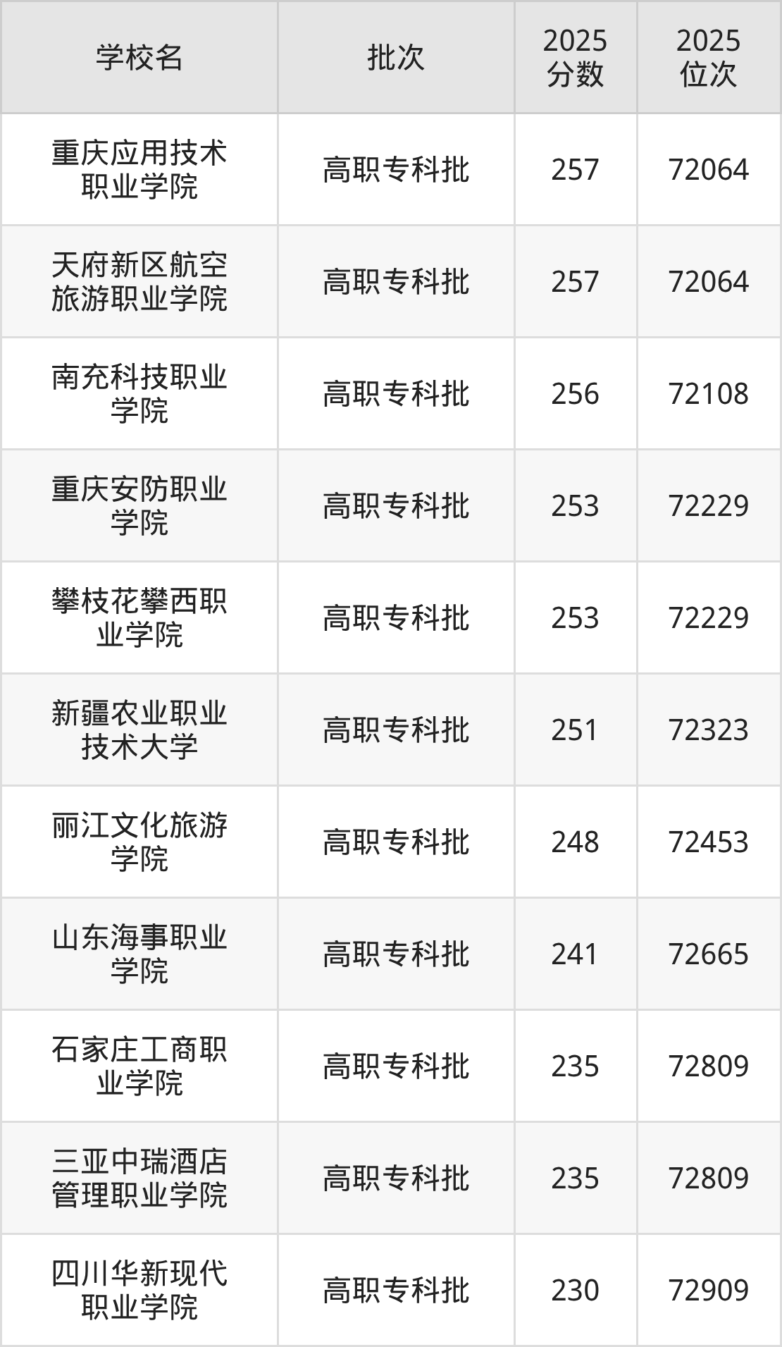 2025年重庆高考历史类247分(72454名~72486名)录取位次低于该区间(较稳妥)的有山东海事职业学院(72665名)、石家庄工商职业学院(72809名)等;录取位次高于该区间(可冲)的有丽江文化旅游学院(72453名)、新疆农业职业技术大学(72323名)等。