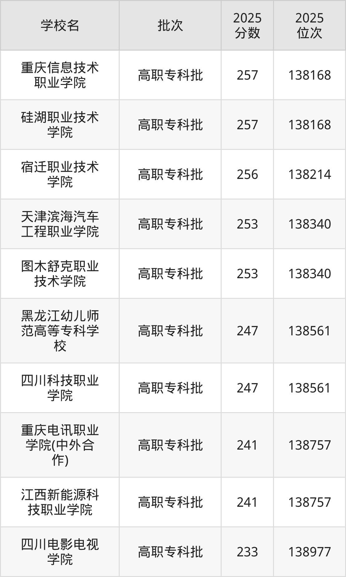 2025年重庆高考物理类247分(138522名~138561名)能上的大学有四川科技职业学院、黑龙江幼儿师范高等专科学校。
