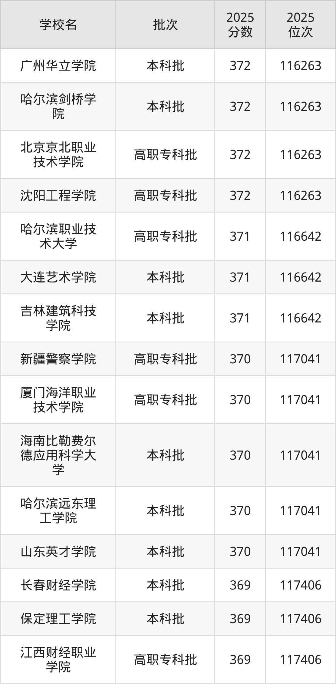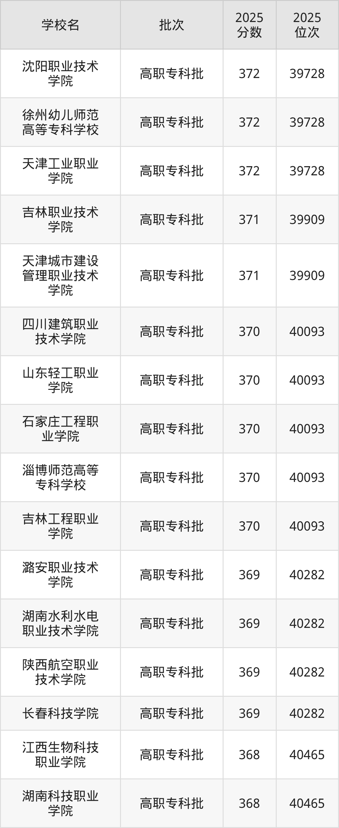 2025年辽宁高考历史类370分(39910名~40093名)能上的大学有吉林工程职业学院、淄博师范高等专科学校、石家庄工程职业学院、山东轻工职业学院等。