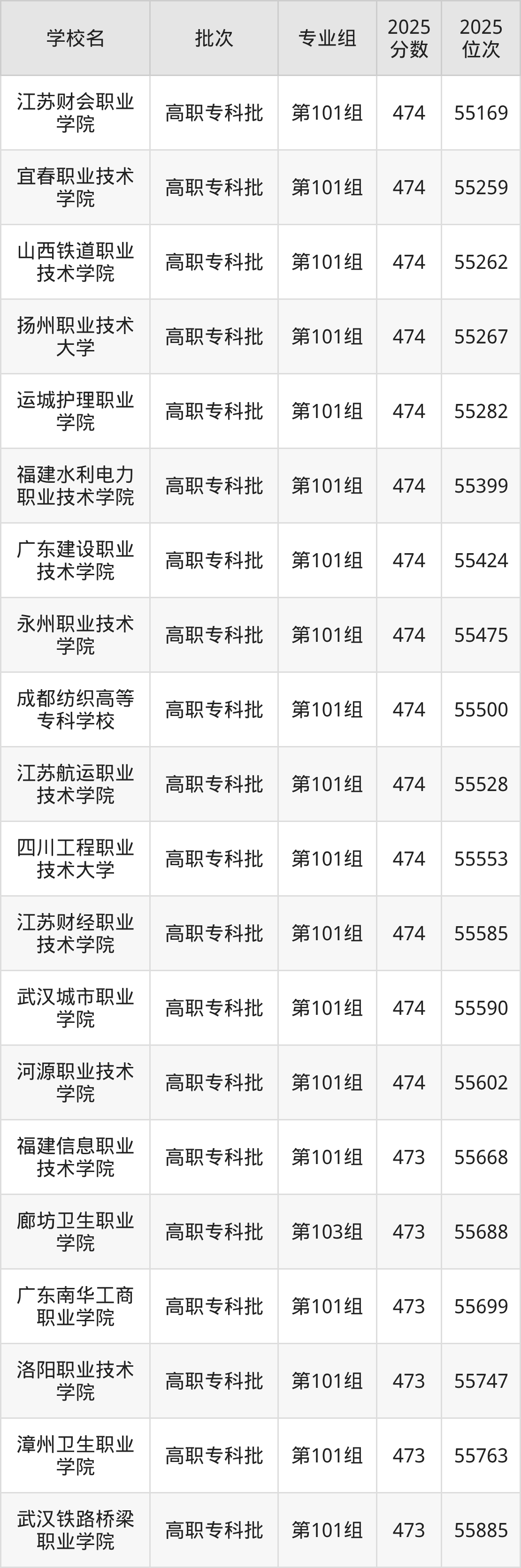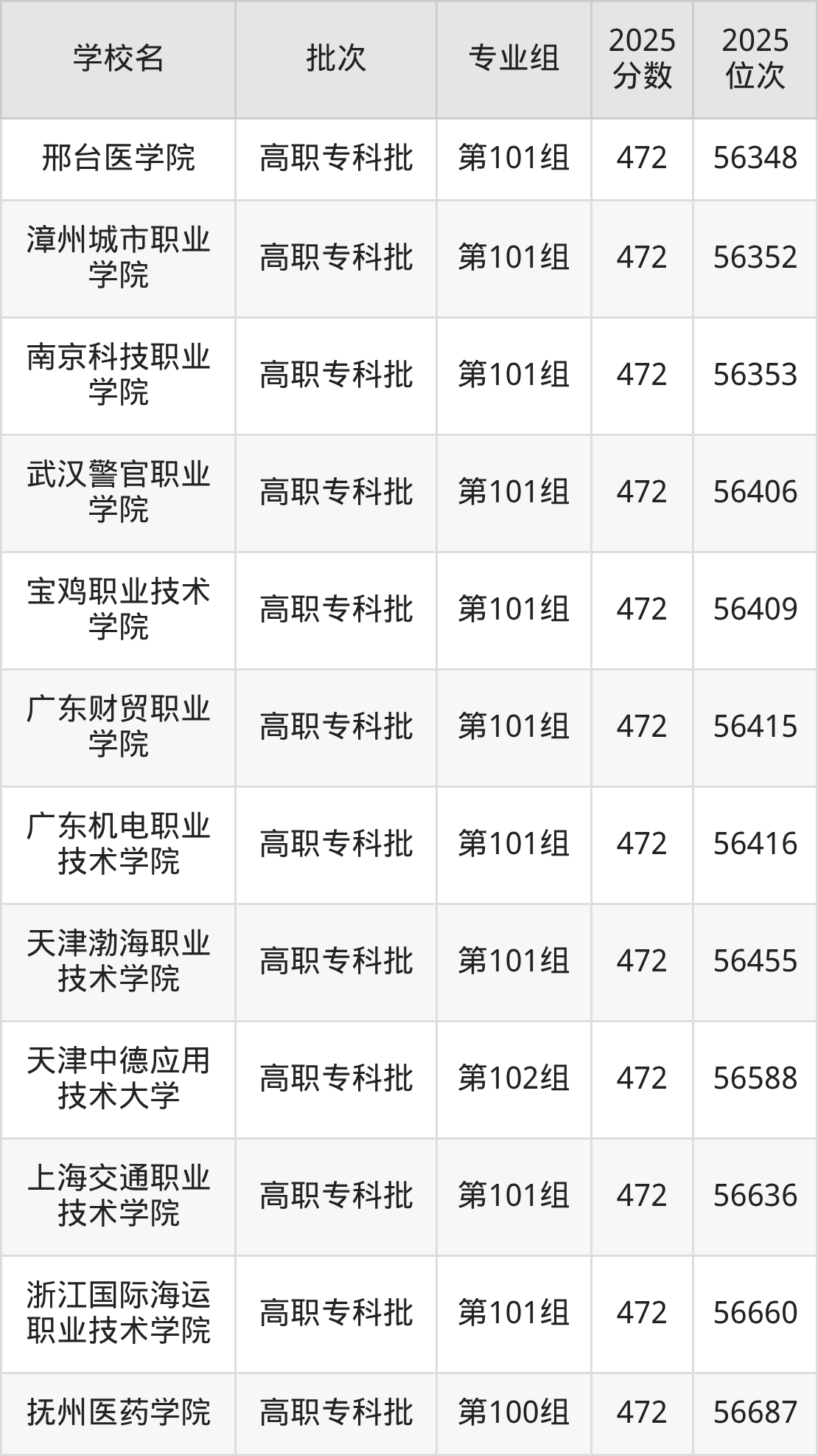 另外录取位次低于该区间(较稳妥)的有邢台医学院第101组(56348名)、漳州城市职业学院第101组(56352名)等;录取位次高于该区间(可冲)的有河源职业技术学院第101组(55602名)、武汉城市职业学院第101组(55590名)等。