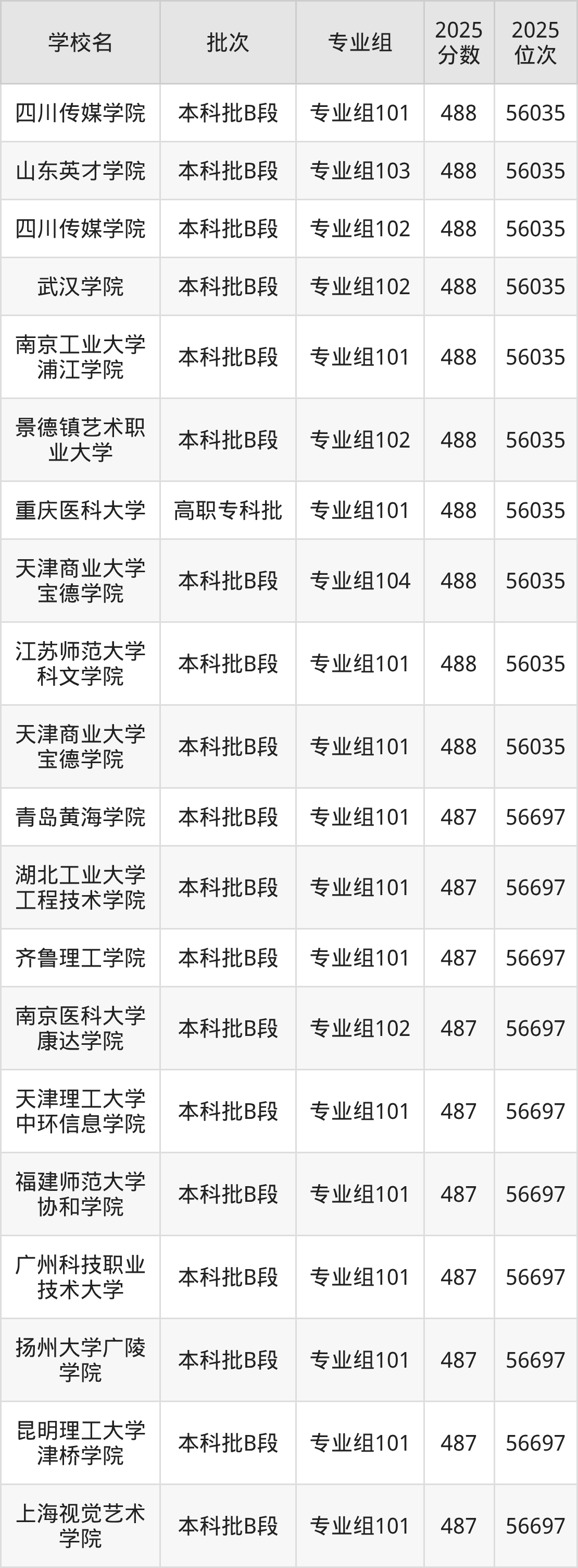 2025年四川高考历史类487分(56036名~56697名)能上的大学有青岛黄海学院专业组101、齐鲁理工学院专业组101、南京医科大学康达学院专业组102、天津理工大学中环信息学院专业组101等。