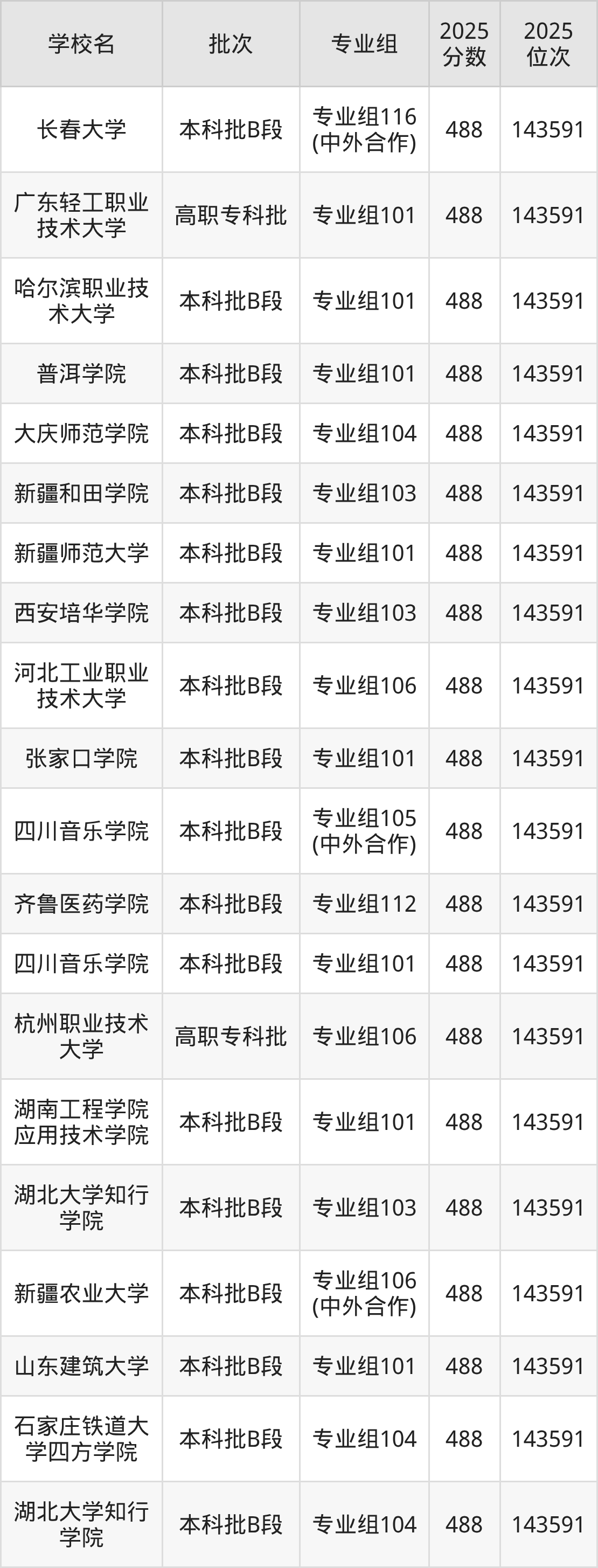另外录取位次低于该区间(较稳妥)的有新疆工程学院专业组101(146356名)、滨州医学院专业组105(146356名)等;录取位次高于该区间(可冲)的有茅台学院专业组101(143591名)、长春大学专业组116(中外合作)(143591名)等。