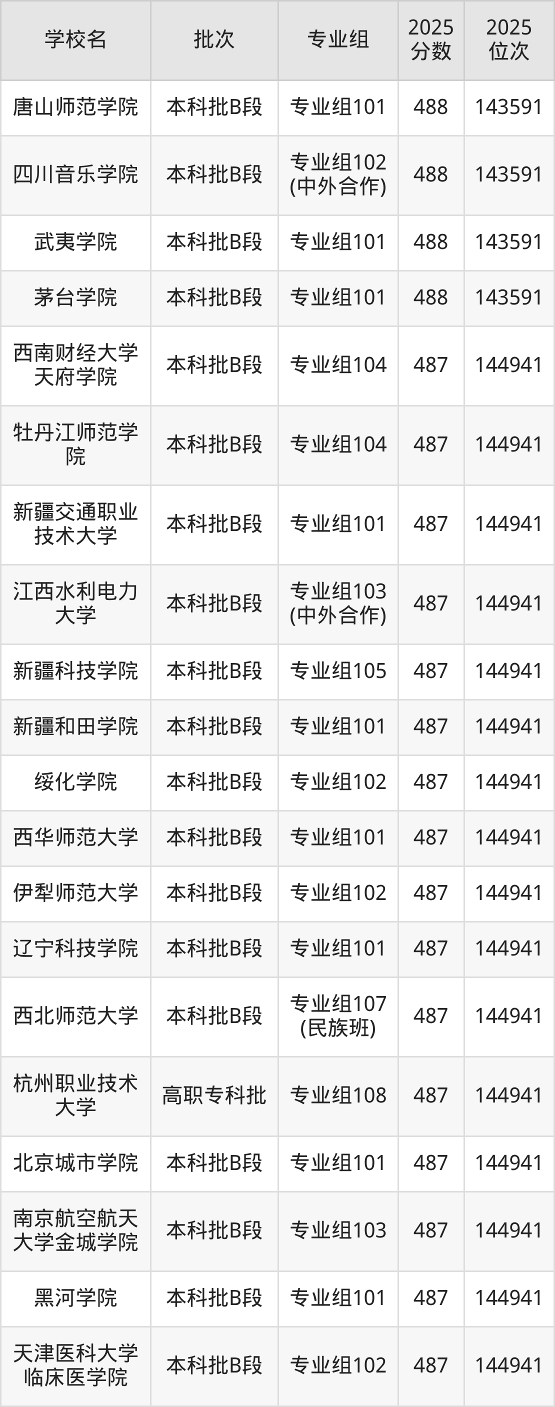 2025年四川高考物理类487分(143592名~144941名)能上的大学有河北工业职业技术大学专业组104、天津医科大学临床医学院专业组102、黑河学院专业组101、南京航空航天大学金城学院专业组103等。