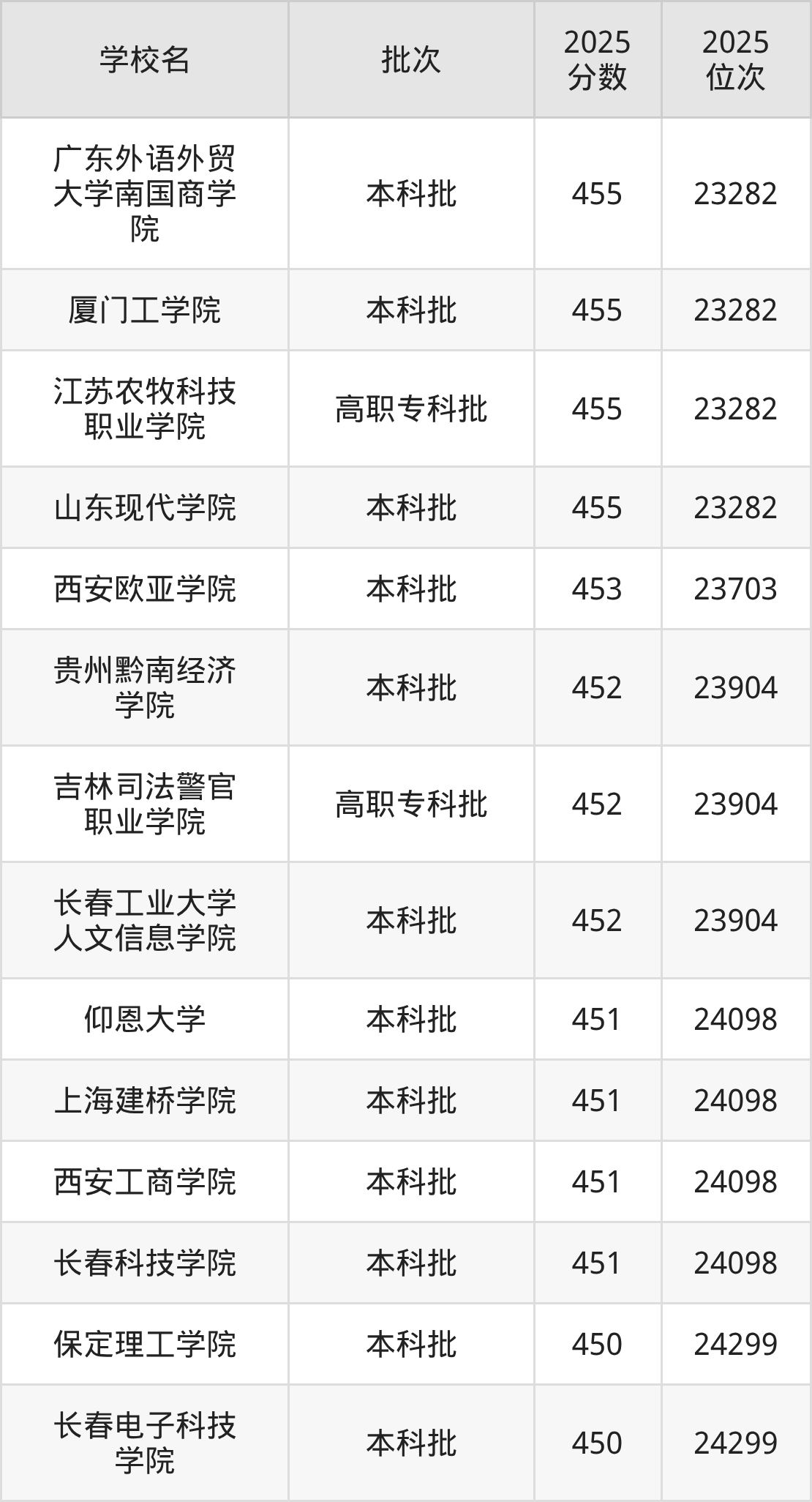 2025年辽宁高考历史类452分(23704名~23904名)能上的大学有长春工业大学人文信息学院、吉林司法警官职业学院、贵州黔南经济学院。