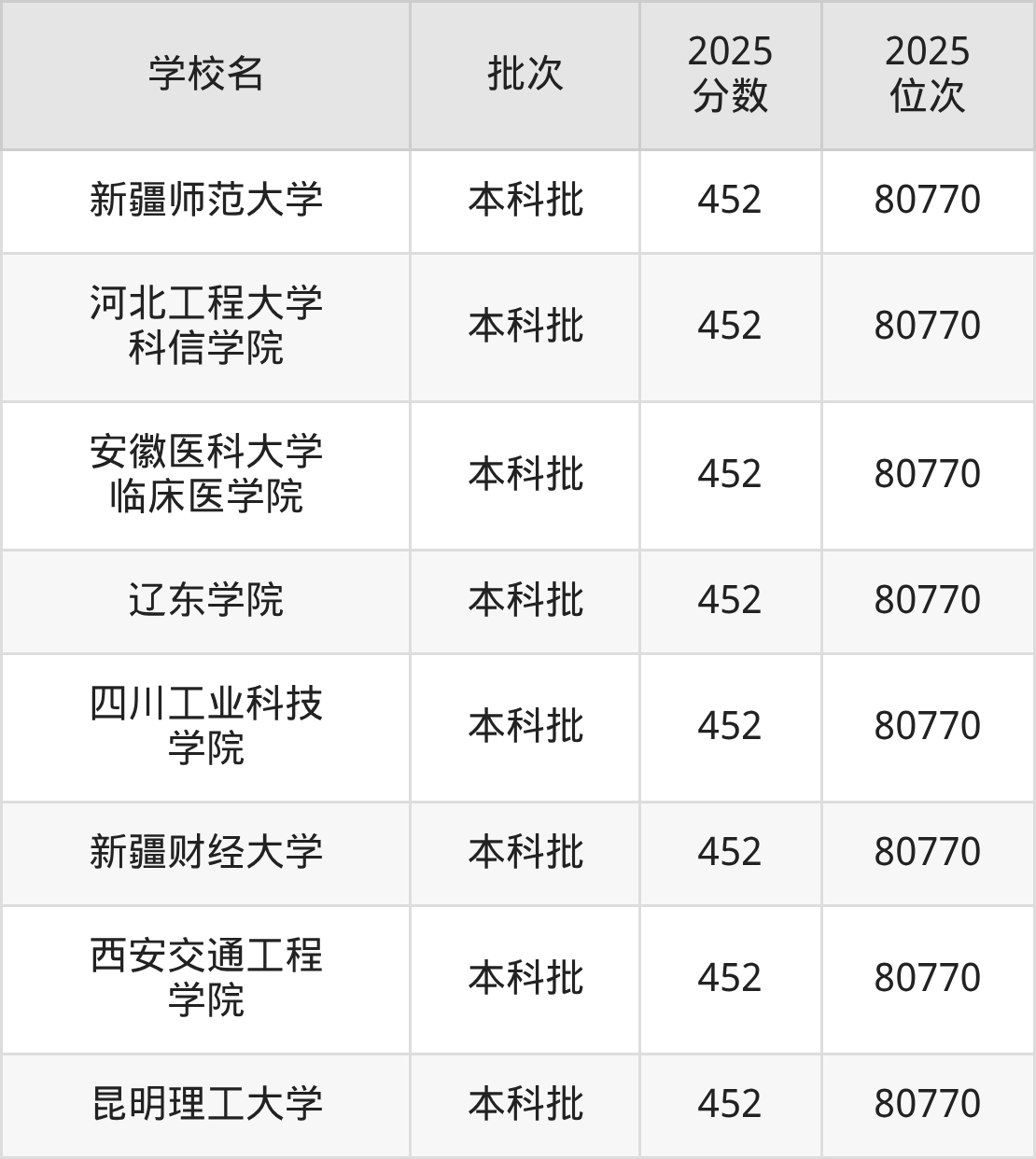 2025年辽宁高考物理类452分(80264名~80770名)能上的大学有新疆工业学院、珠海科技学院、新疆财经大学、安徽医科大学临床医学院等。