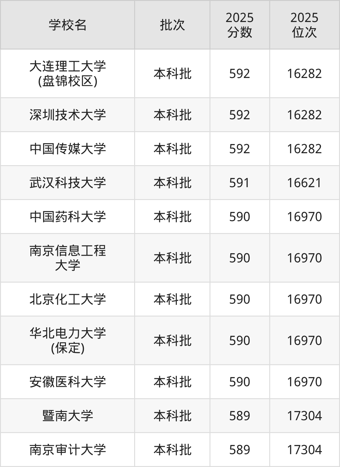 2025年辽宁高考物理类590分(16622名~16970名)能上的大学有安徽医科大学、华北电力大学(保定)、中国药科大学、北京化工大学等。