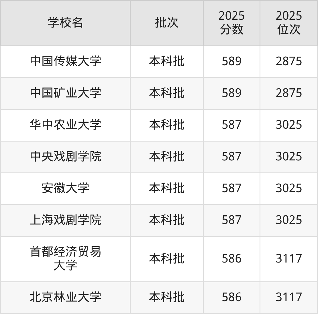 另外录取位次低于该区间(较稳妥)的有中国传媒大学(2875名)、中国矿业大学(2875名)等;录取位次高于该区间(可冲)的有湖南师范大学(2702名)、武汉理工大学(2702名)等。