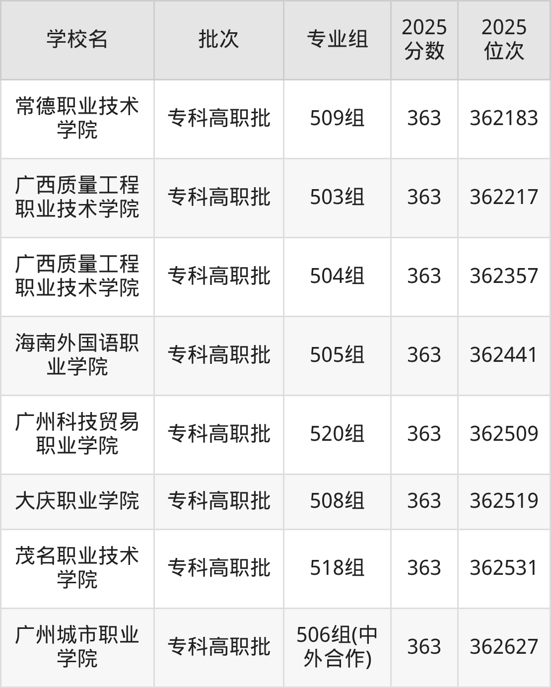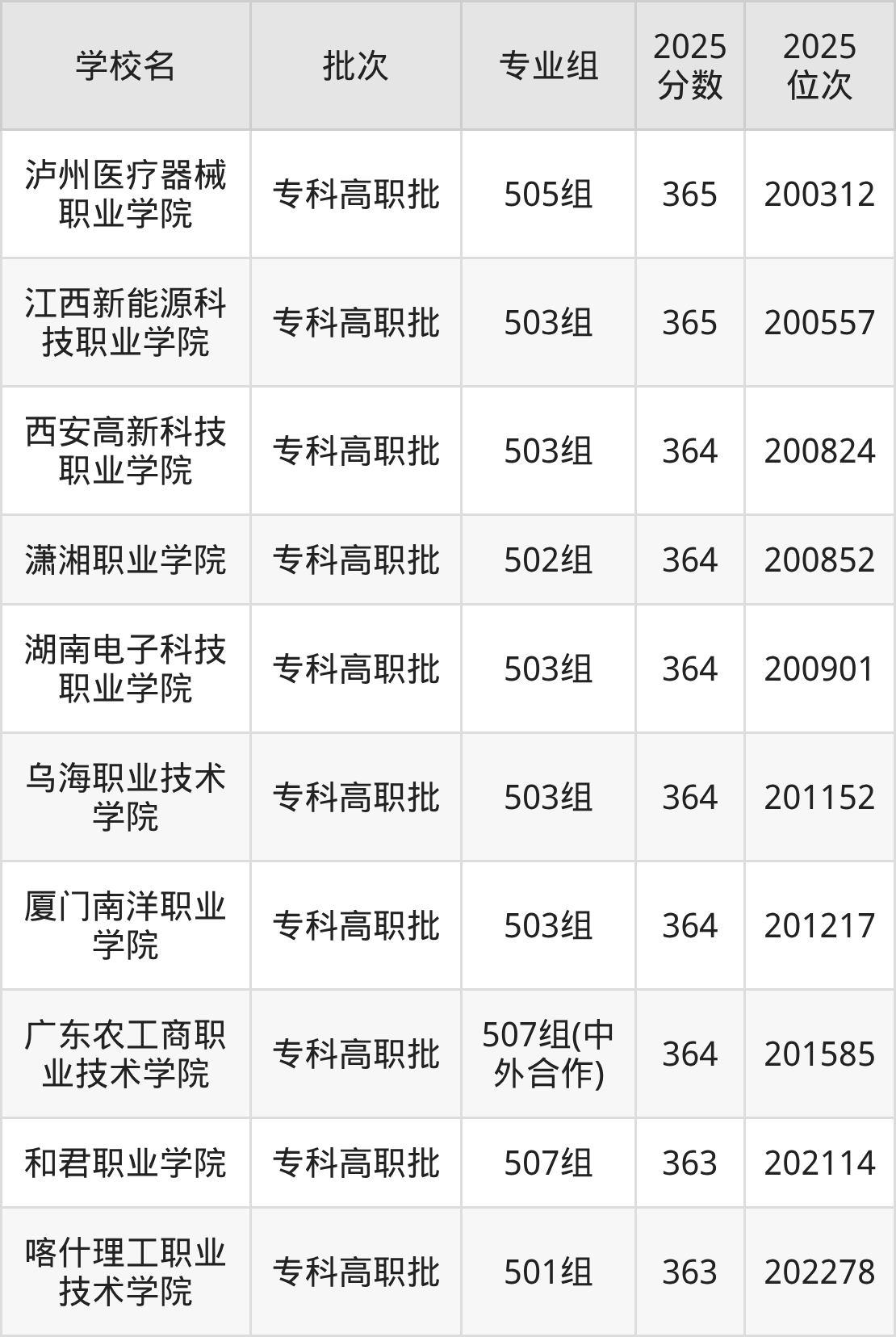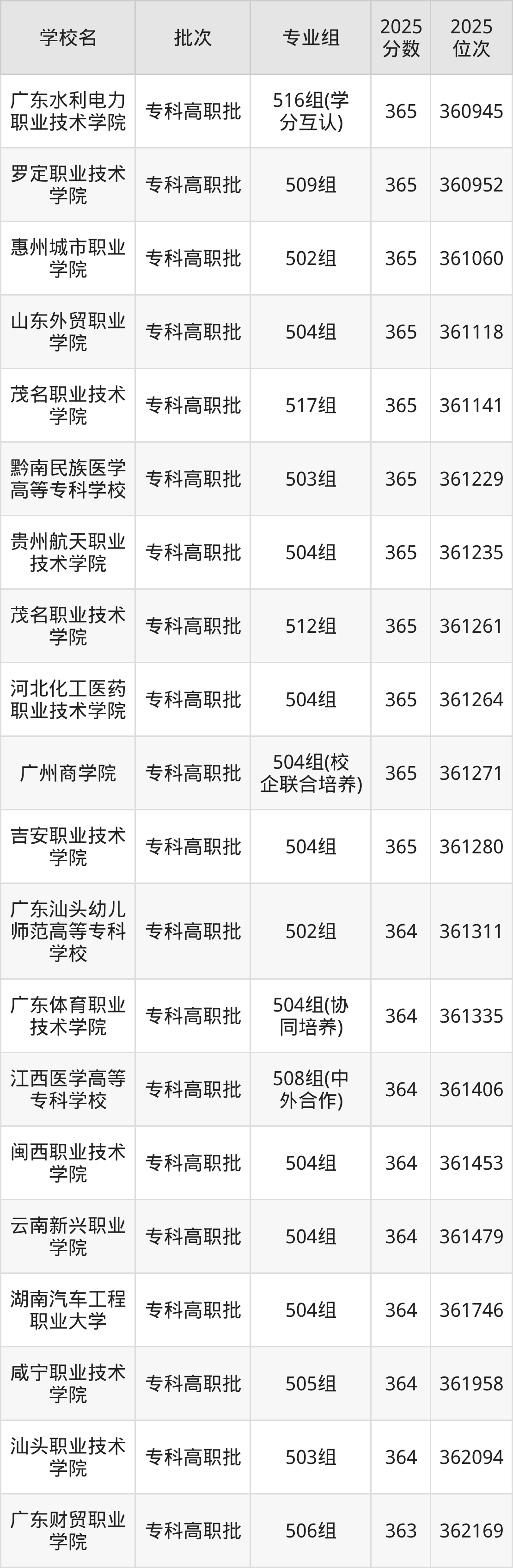2025年广东高考物理类364分(361277名~362138名)能上的大学有江西医学高等专科学校508组(中外合作)、闽西职业技术学院504组、广东体育职业技术学院504组(协同培养)、汕头职业技术学院503组等。