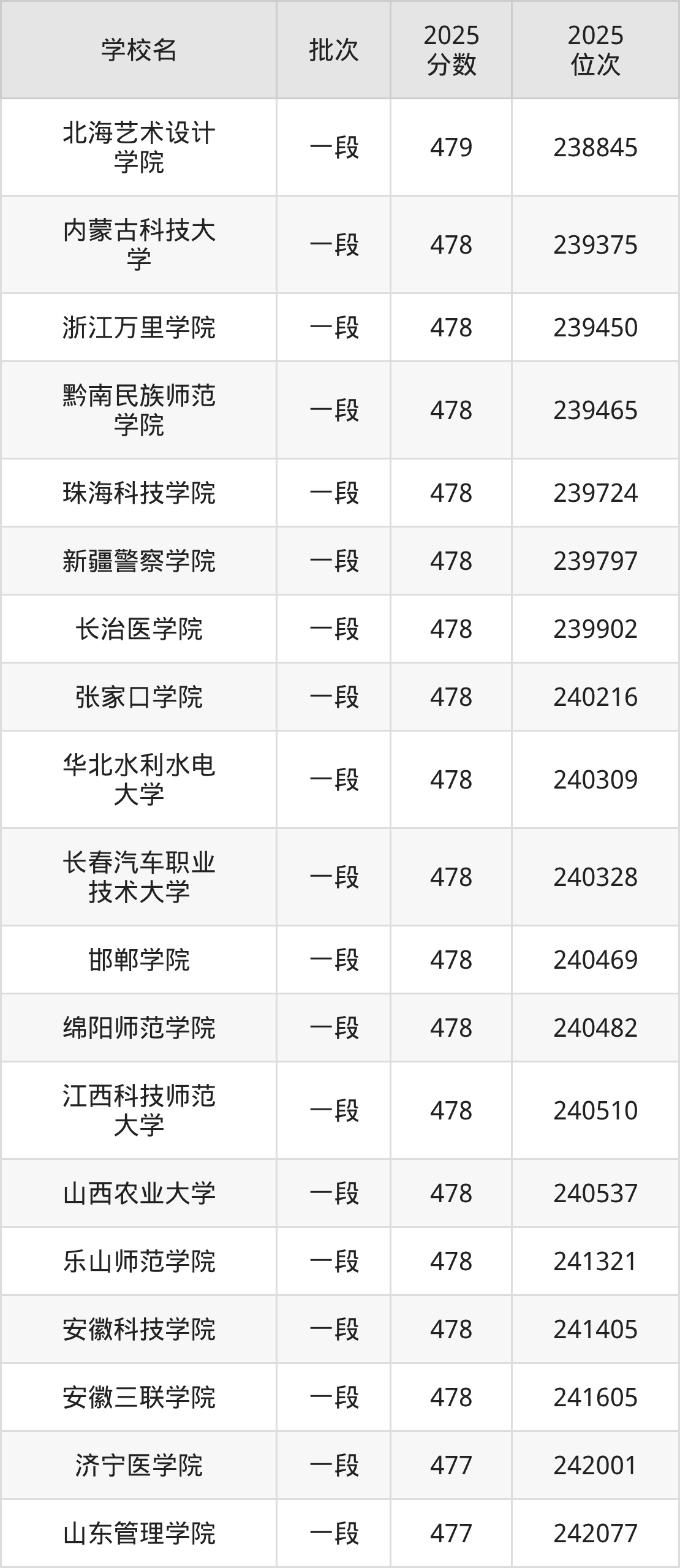 2025年山东高考478分(239279名~241814名)能上的大学有安徽三联学院、张家口学院、浙江万里学院、长治医学院等。