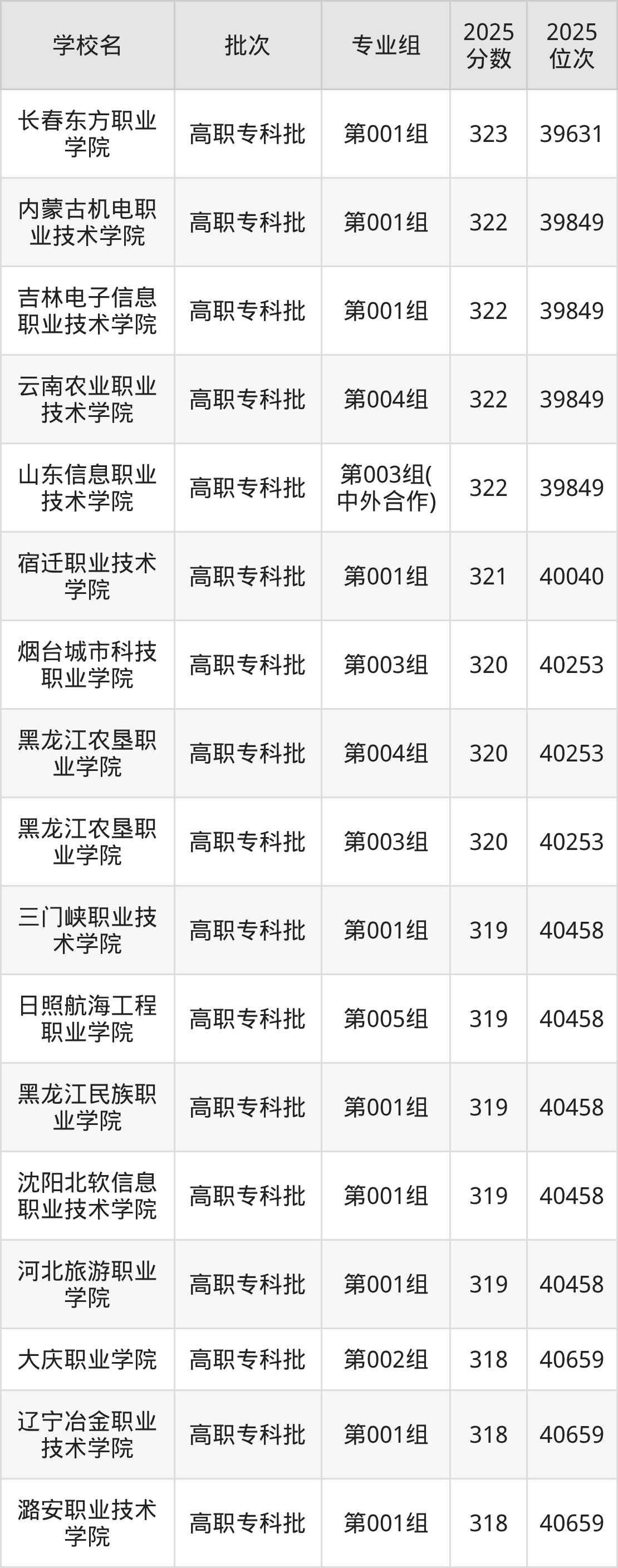 2025年黑龙江高考历史类320分(40041名~40253名)能上的大学有黑龙江农垦职业学院第003组、黑龙江农垦职业学院第004组、烟台城市科技职业学院第003组。