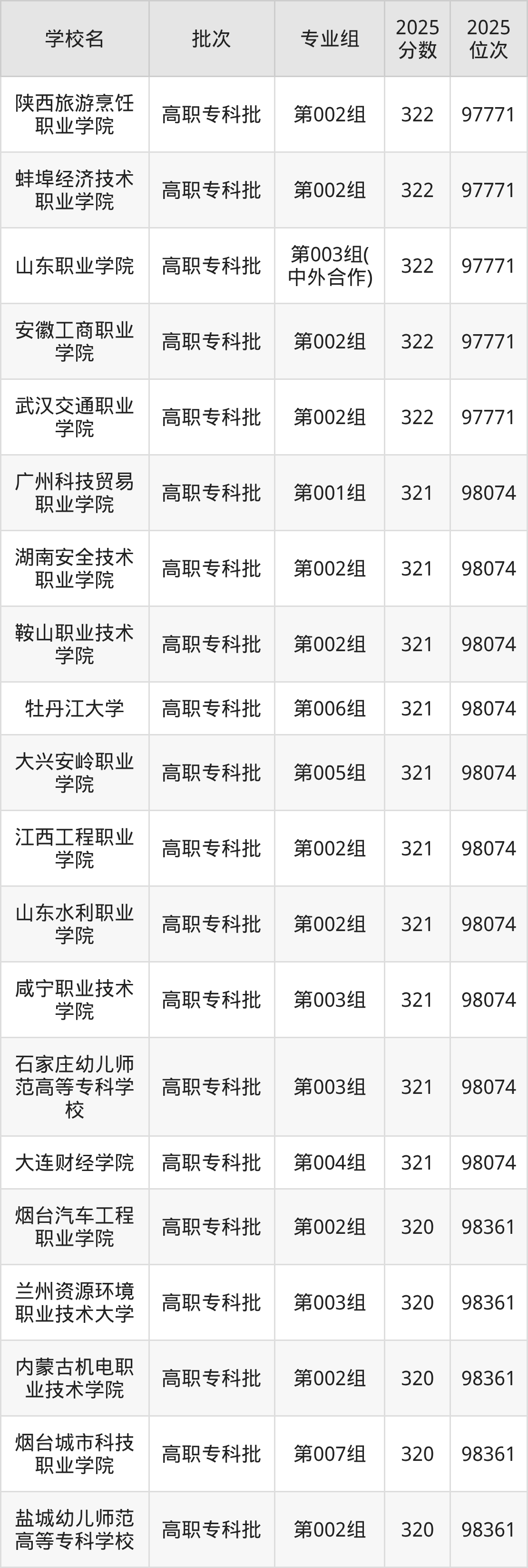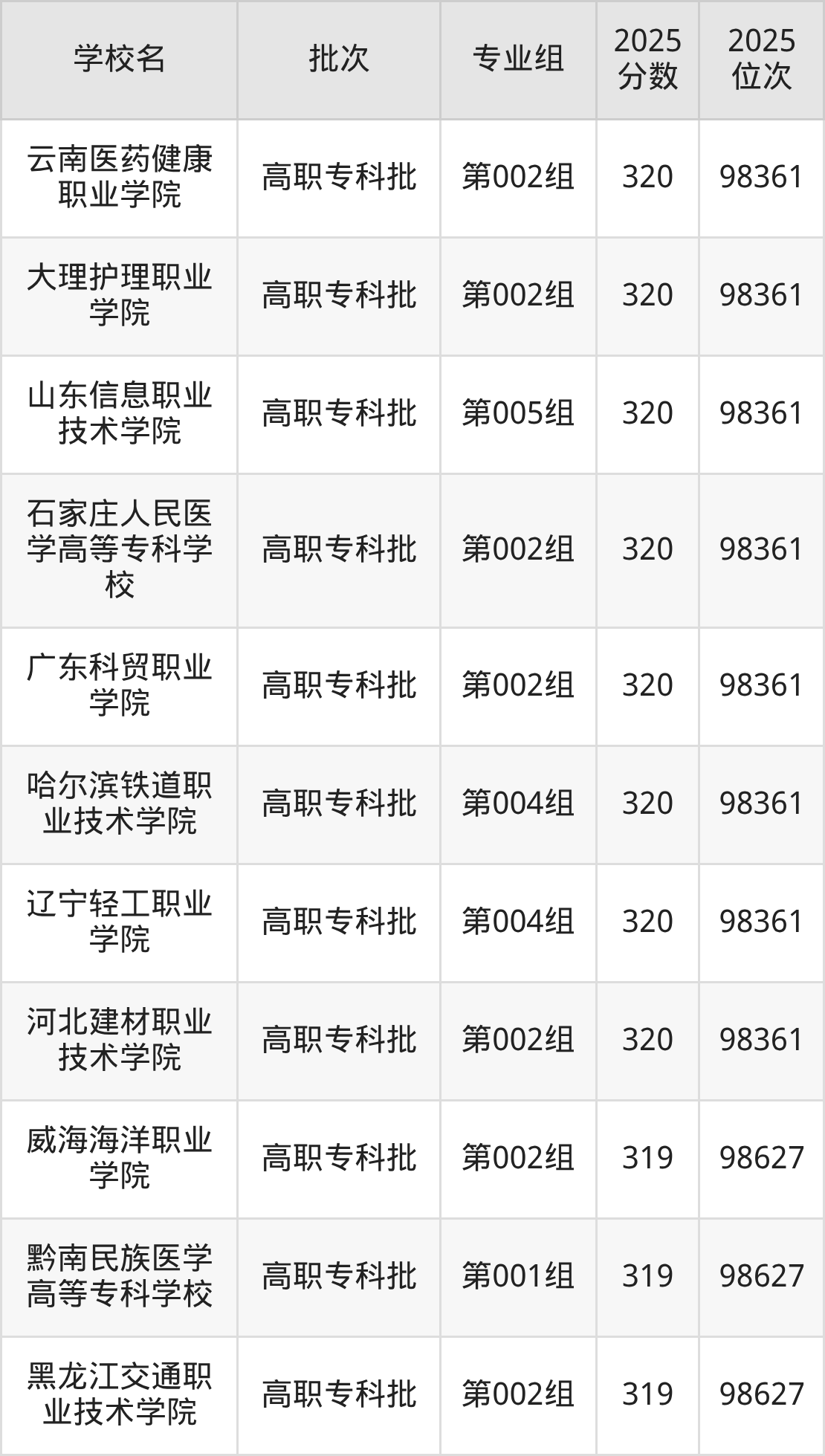 2025年黑龙江高考物理类320分(98075名~98361名)能上的大学有兰州资源环境职业技术大学第003组、河北建材职业技术学院第002组、石家庄人民医学高等专科学校第002组、内蒙古机电职业技术学院第002组等。