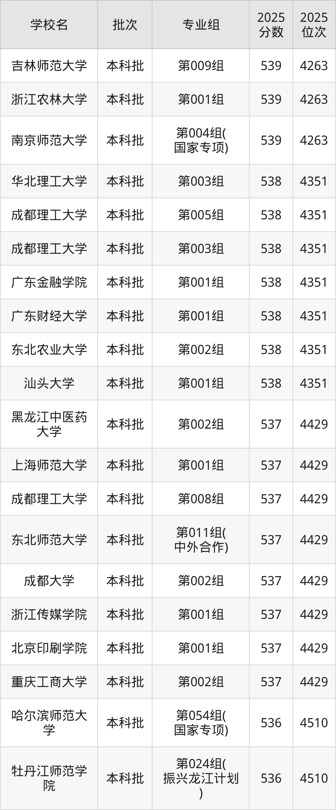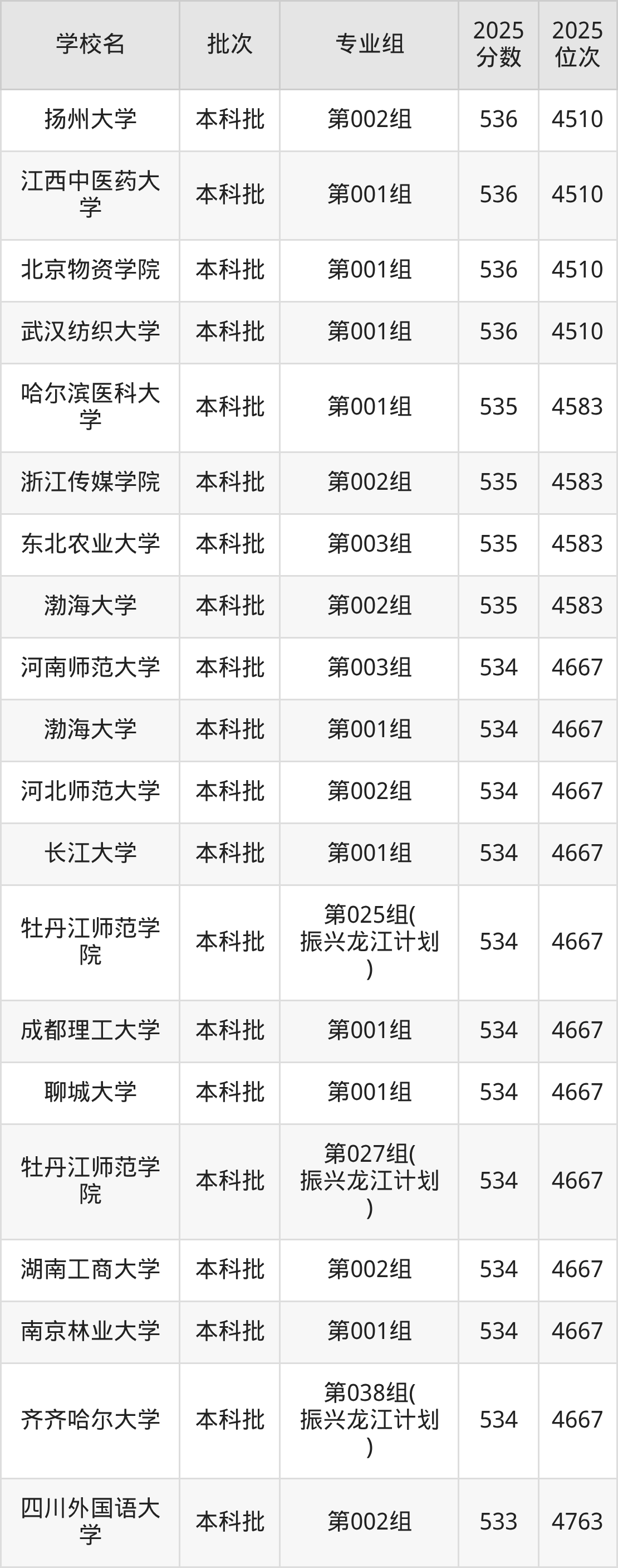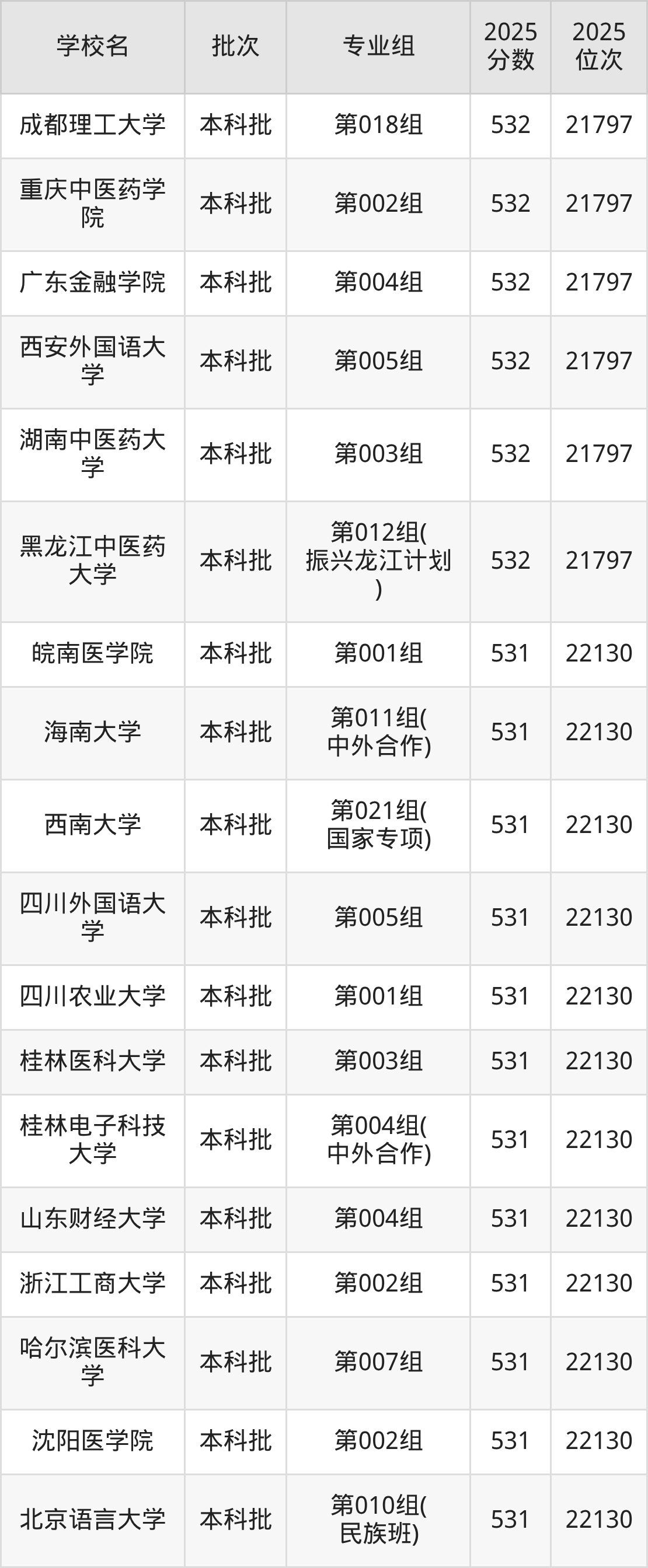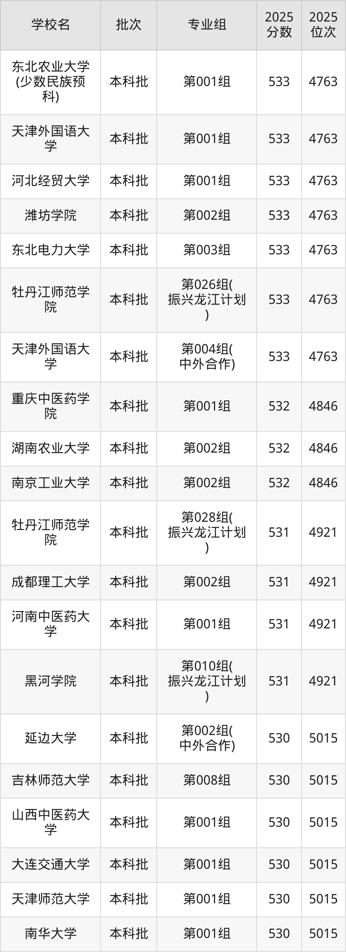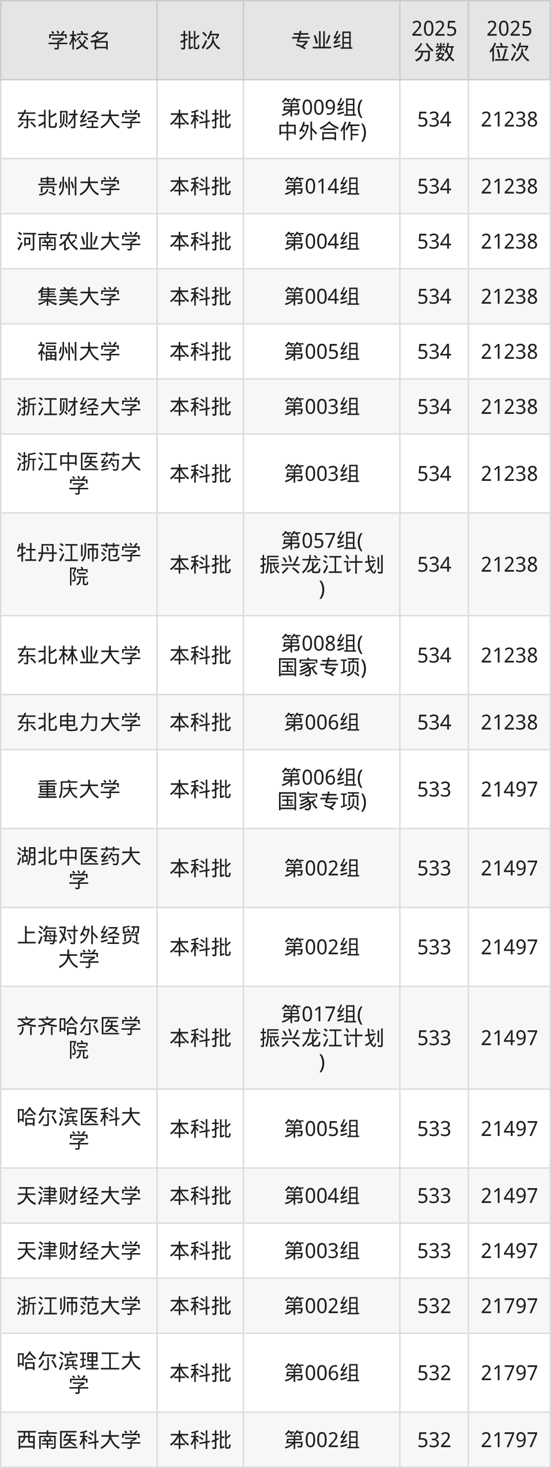2025年黑龙江高考物理类532分(21498名~21797名)能上的大学有哈尔滨理工大学第006组、黑龙江中医药大学第012组(振兴龙江计划)、浙江师范大学第002组、湖南中医药大学第003组等。