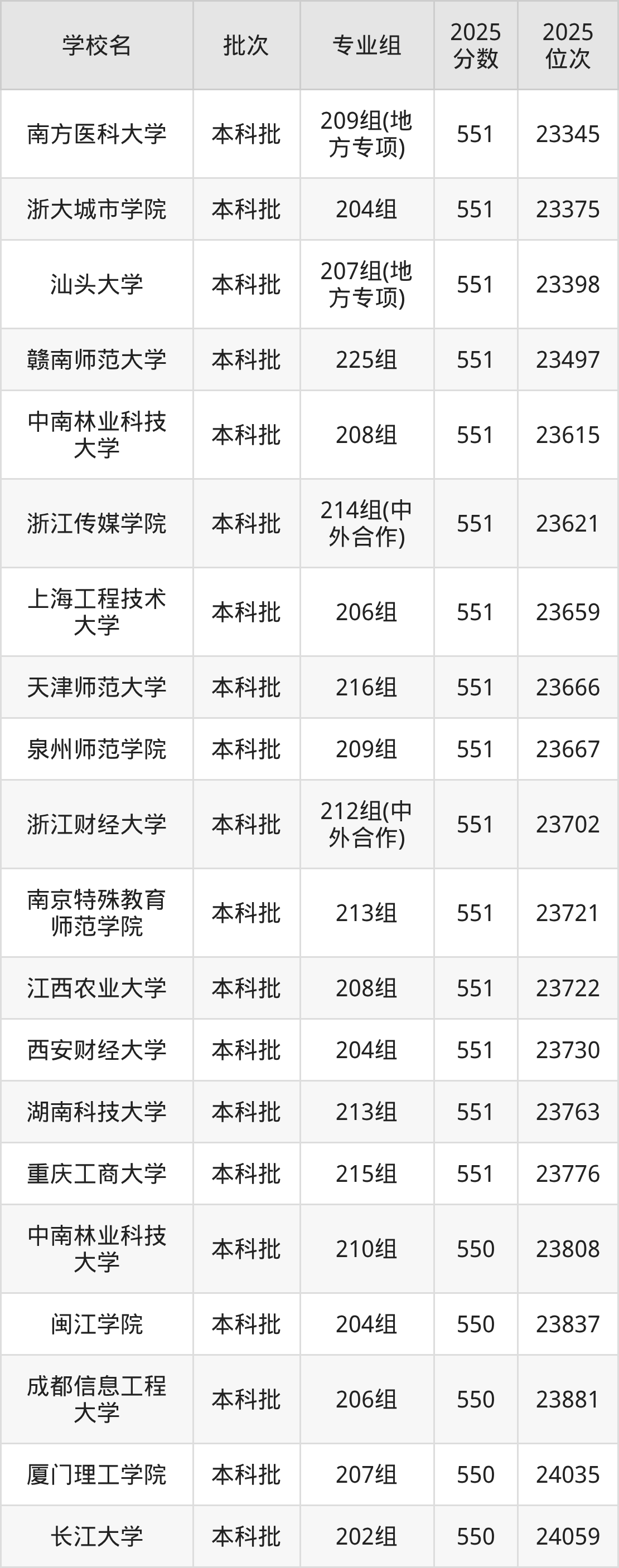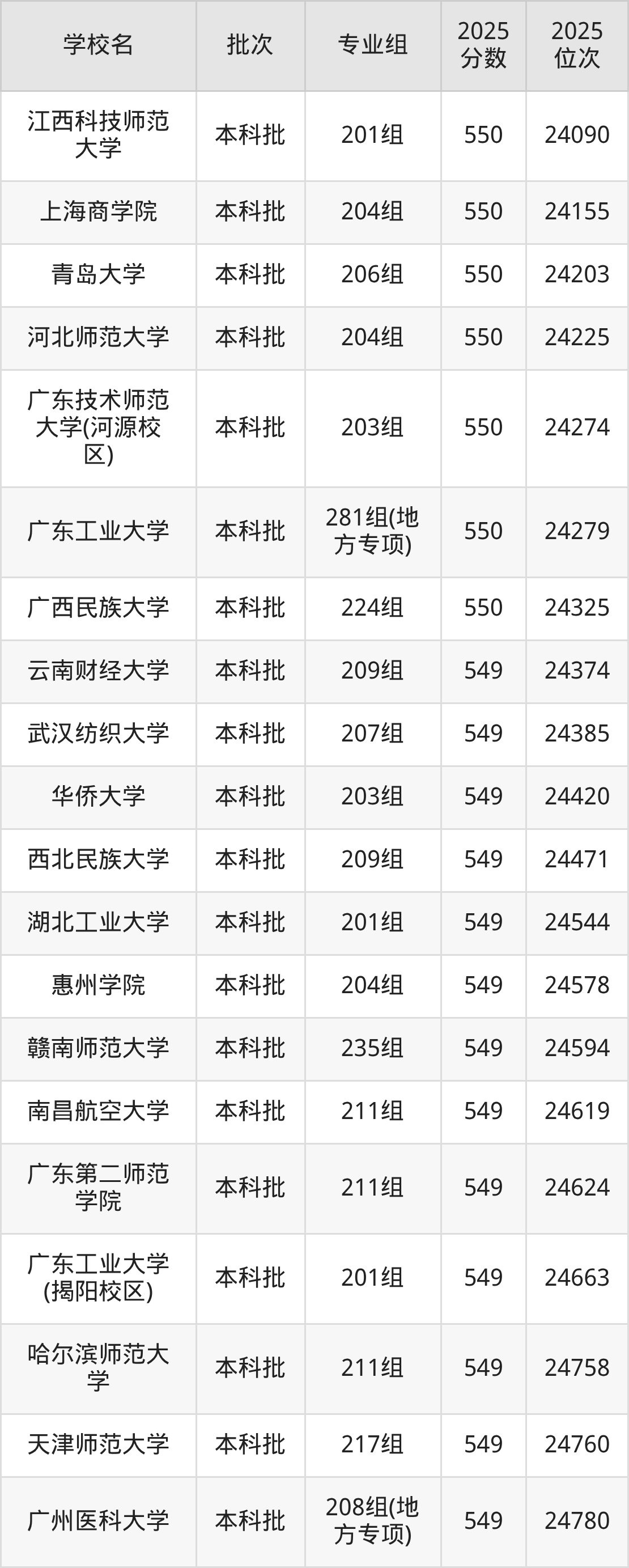 2025年广东高考历史类550分(23797名~24335名)能上的大学有河北师范大学204组、闽江学院204组、长江大学202组、中南林业科技大学210组等。